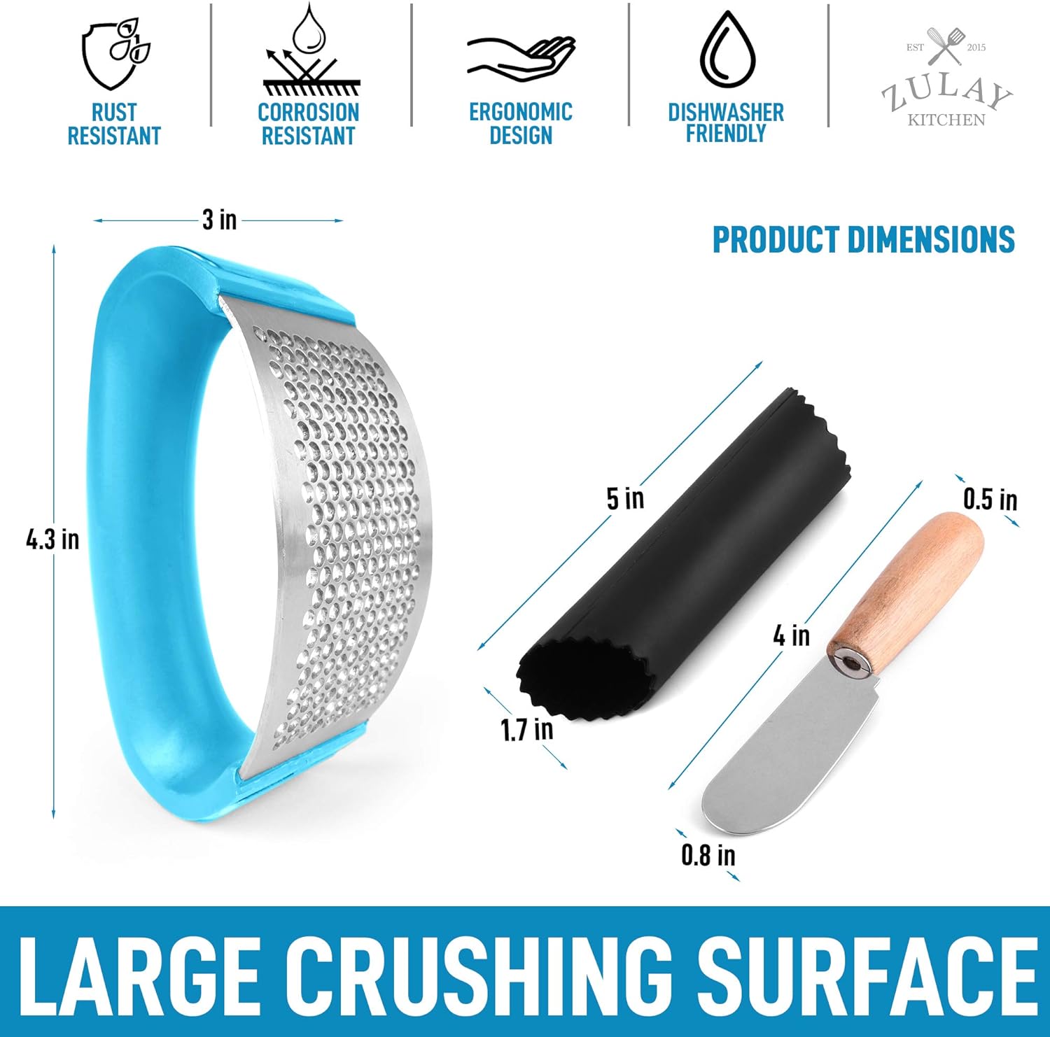 Zulay Kitchen Stainless Steel Garlic Press Rocker Set - Premium Garlic Mincer Garlic Crusher - New Innovative Garlic Crusher with Peeler and Scraper - Comfortable Grip (Blue)