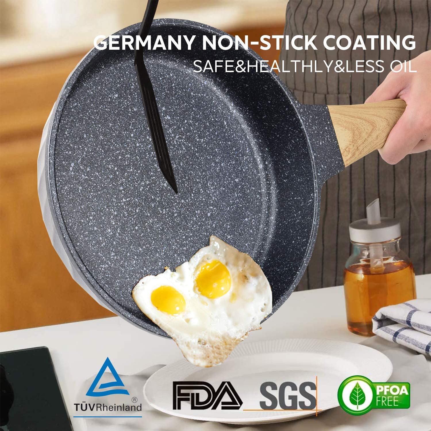 • Safety Healthy Cooking: The nonstick pan is coated with a medical stone that owns certifications from FDA, BSCI & LFGB. The natural mineral nonstick coating is very durable and at the same time 100% free of PFOA, PTFA, lead and cadmium, it is designed for healthy cooking.