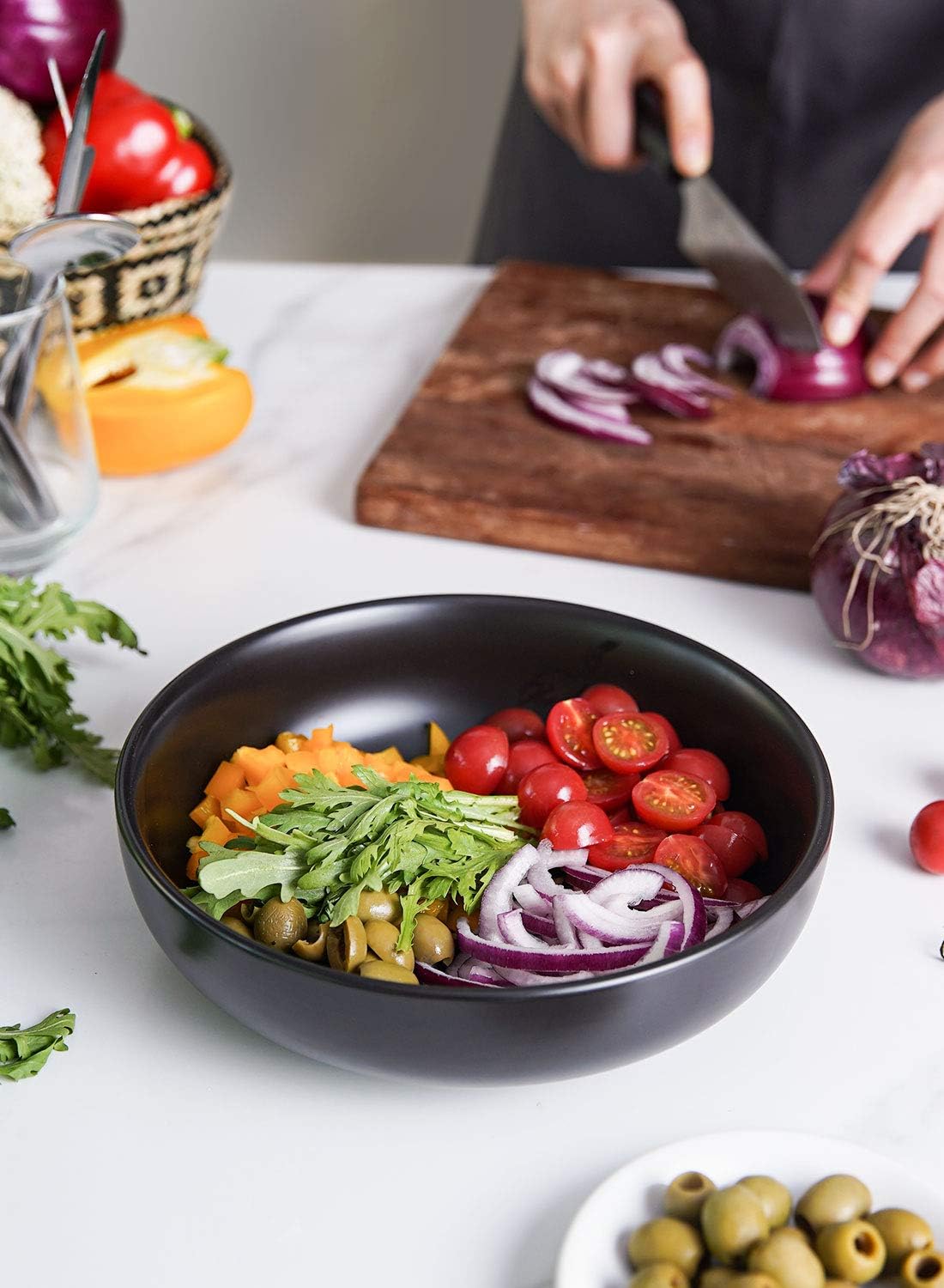LE TAUCI Pasta Bowls 45 oz, Salad Bowls Set for Serving Soup, Pasta, Noodle, Dinner, Large Kitchen Bowl Plates, Microwave Safe - 8.5 Inch, Set of 4, Matte Black