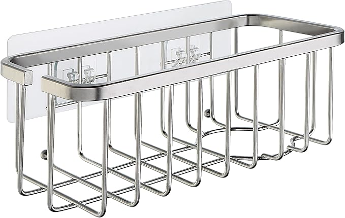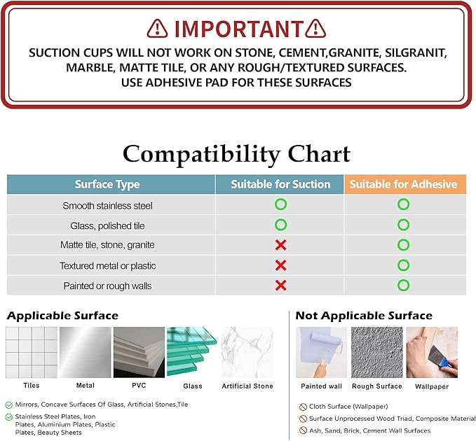 • This product includes the stainless steel basket and mounting accessories (adhesive pad + suction cups). Important Compatibility Notice – Suction cups work only on smooth, non-porous surfaces such as polished tile, stainless steel, or glass. For textured, stone, or matte finishes, use the included adhesive pad instead.