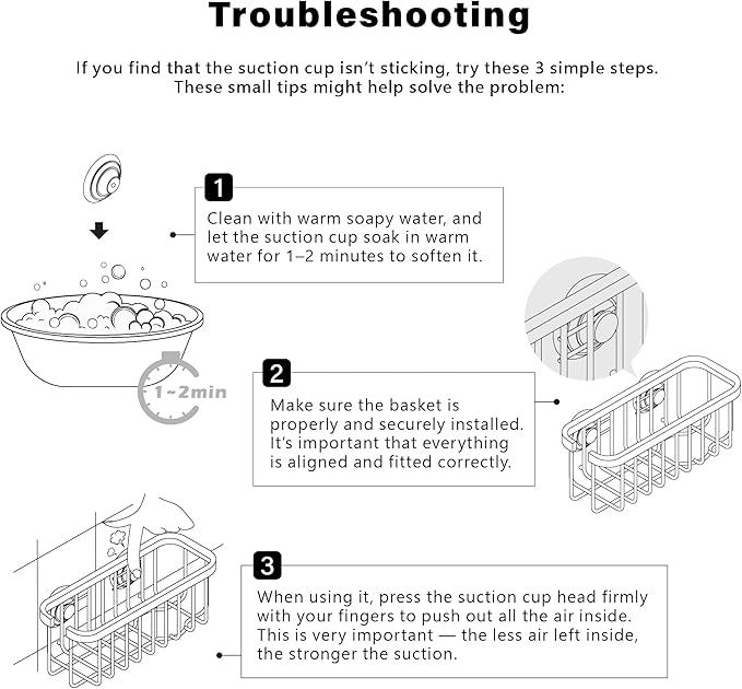 • If you find that the suction cup isn’t sticking, please first confirm whether your sink surface is suitable for suction cups. We also provide a detailed troubleshooting guide at the bottom of this page for your reference. If you have any questions or concerns, please contact our customer support team — we’re happy to help.