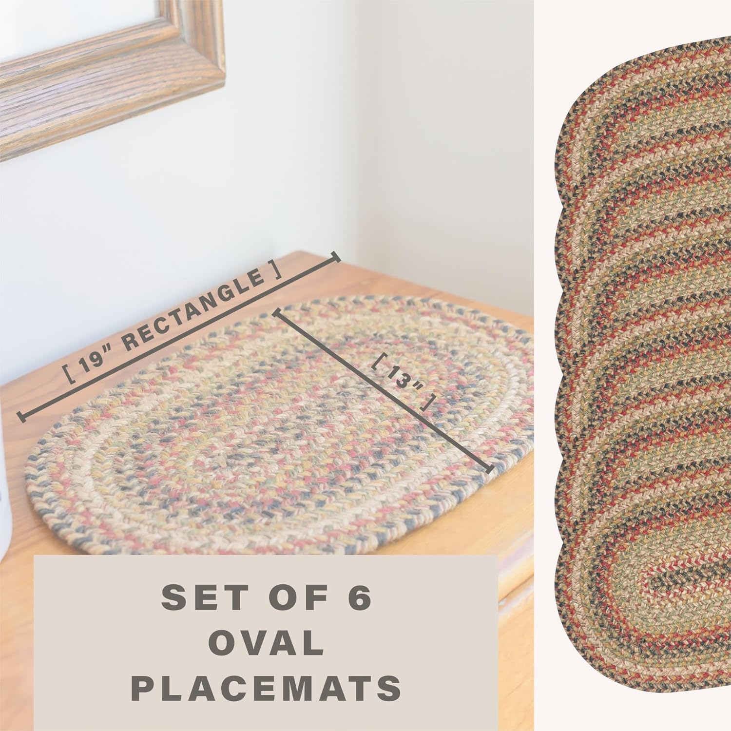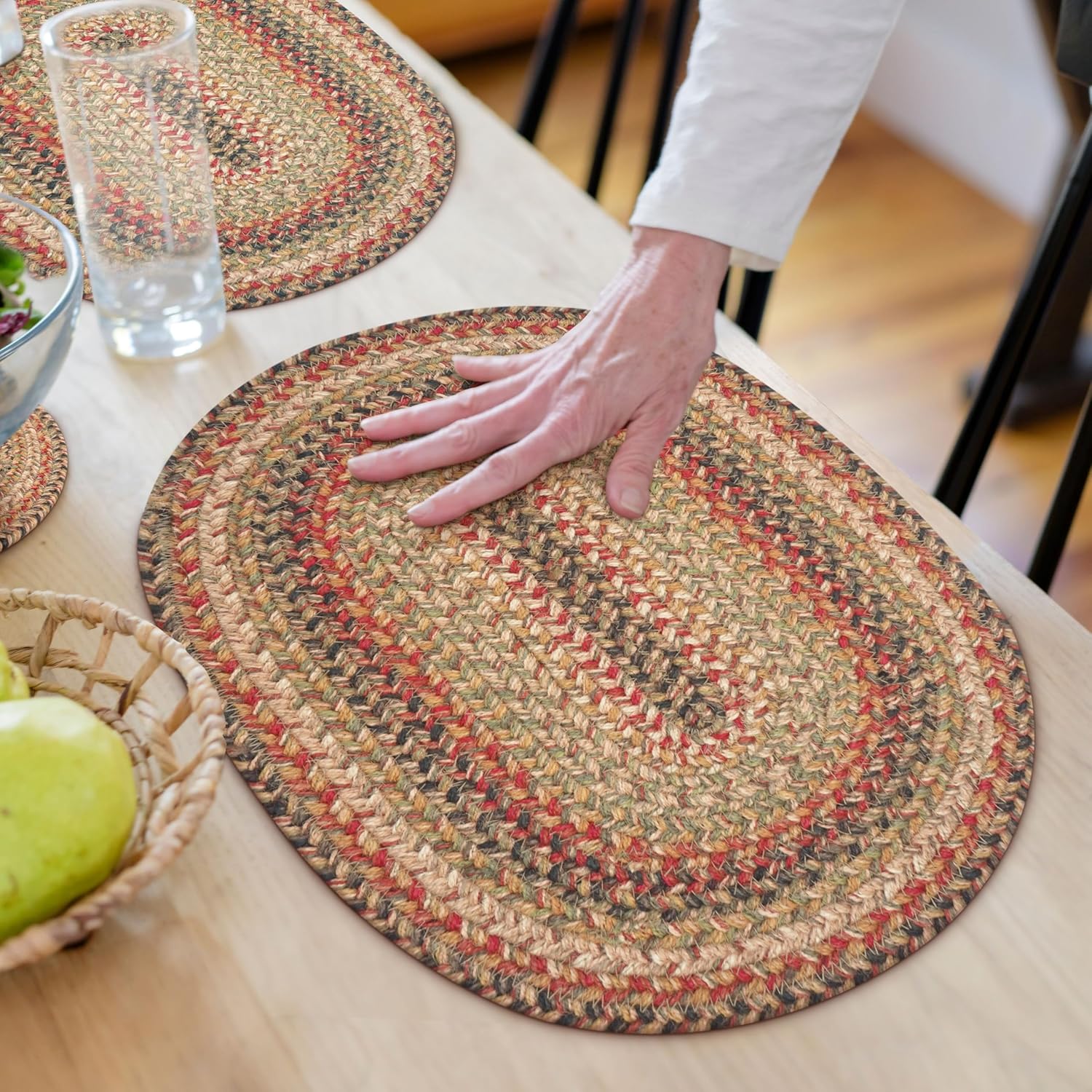 Homespice Kingston Jute Braided Oval Placemats, Warm Country Decor, Set of 6, 13x19 Multicolor Table Mats - Vibrant Colors, Durable, Easy to Clean and Protects Furniture