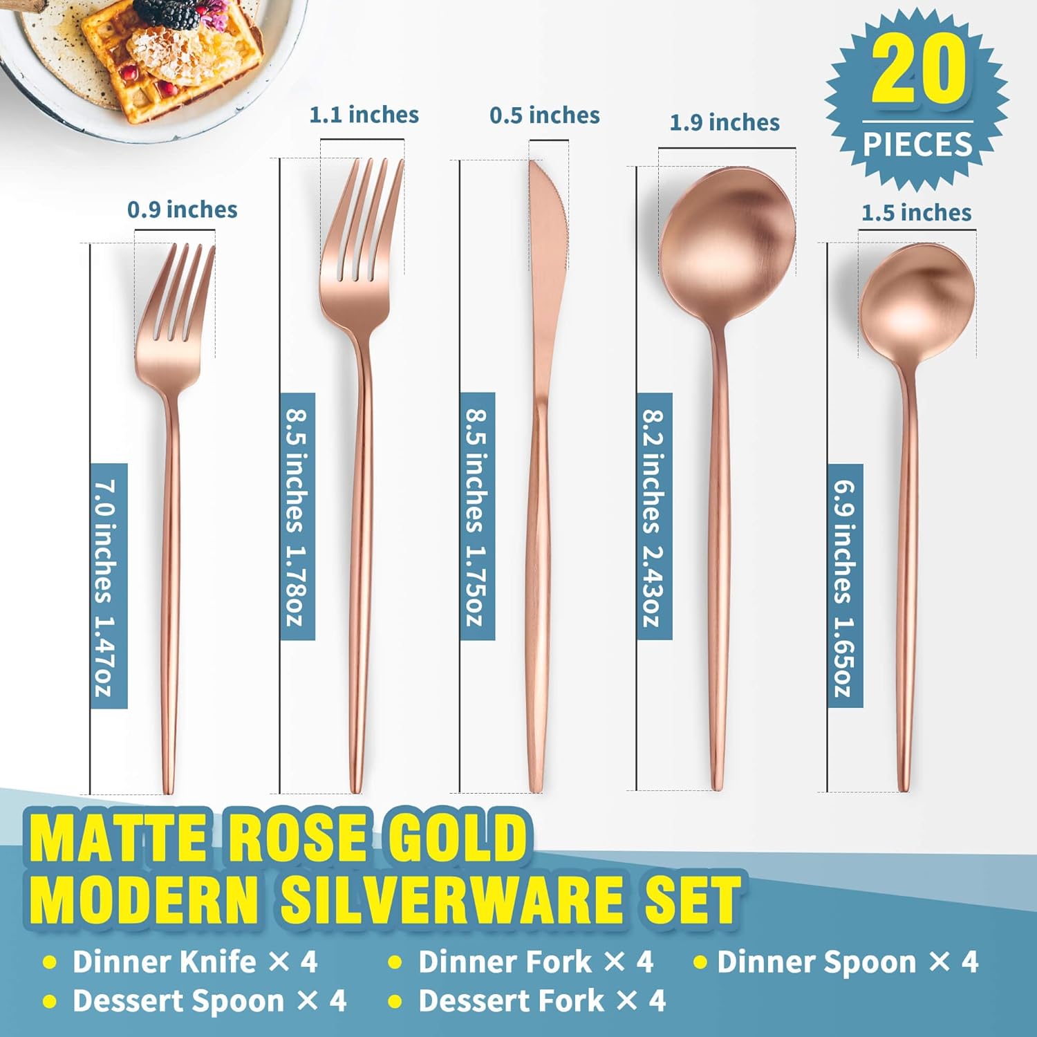 Lemeya Matte Rose Gold Silverware Set for 4,Modern Stainless Steel Brushed Cutlery Set,20-Pieces Heavy Duty Flatware Set,Knives Spoons and Forks Set Utensils Set, Satin Finish, Dishwasher Safe