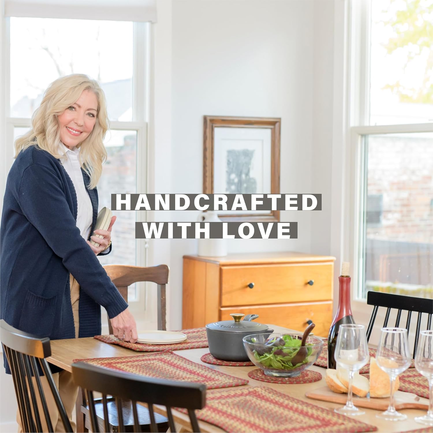 • BRAIDED PLACEMAT FOR A UNIQUE AND COLORFUL DESIGN: Our placemat is not just a plain piece of fabric; it is a braided masterpiece that showcases a unique and colorful design. Each braid is a mosaic of vibrant hues like red, cranberry, green, and cream, creating a stunning contrast and depth. The intricate braiding and depth of color in these placemats make them stand out, turning your table into a focal point of artistic expression.