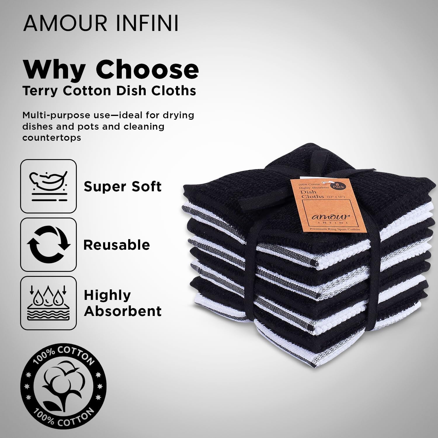 AMOUR INFINI Dish Cloths for Washing Dishes Set of 8 - Highly Absorbent, Super Soft Kitchen Dishcloths - Reusable Quick Dry Dish Rags for Cleaning & Drying Kitchen Linens (12x12 Inch - Black)