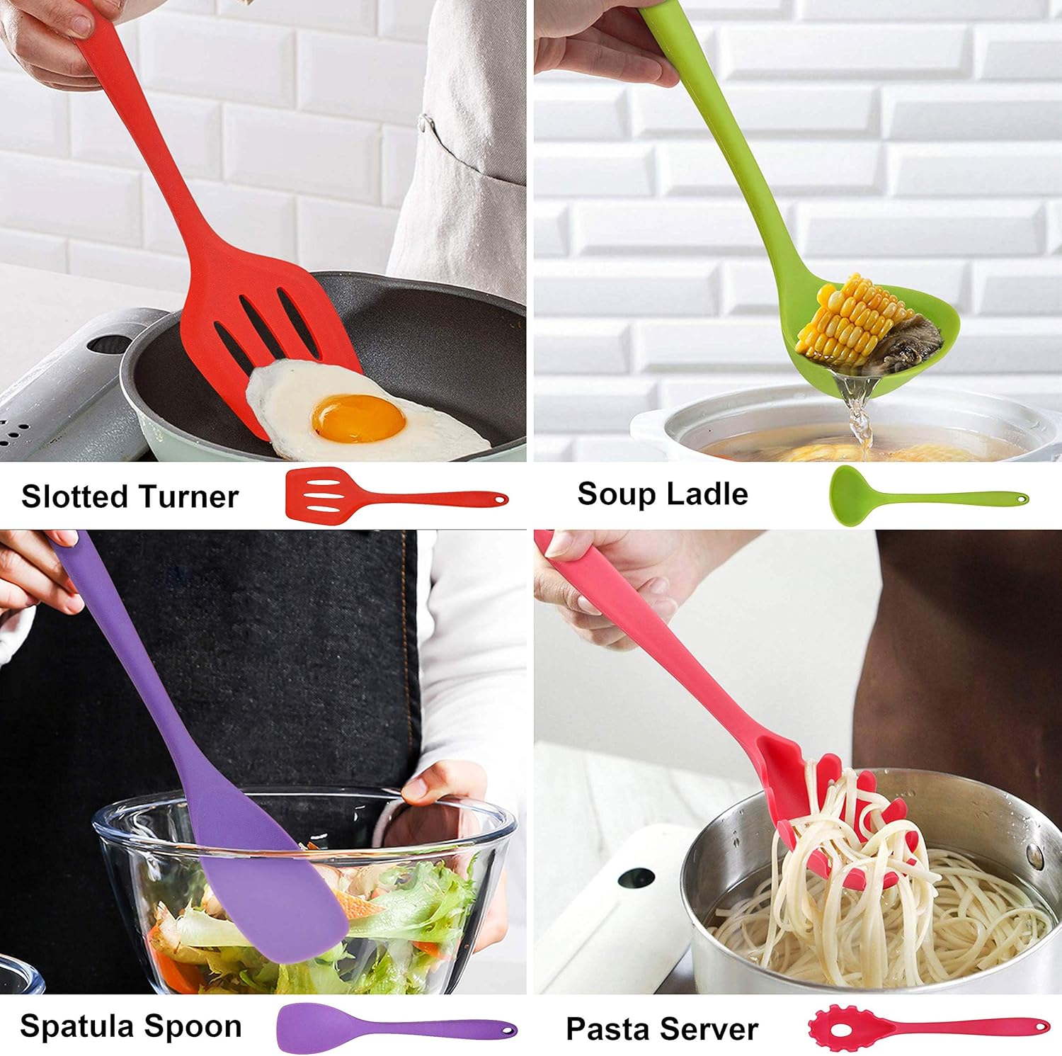 • Heat resistant, this heat resistant silicone cooking utensils set can withstand high temperature up to 446ºF, do not worry about melting at high temperature cooking or leaving in hot pans for a while, perfect for family everyday cooking, stirring, frying, baking and mixing