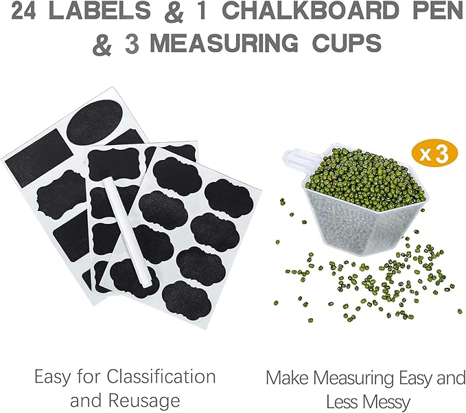 • 24 Reusable Labels and 3 Measuring Cups ---- Cups make measure out ingredients easier and less messy. The Reusable labels can reduce your confusion about those similar items. Dishwasher safe for the container, please hand wash the lid.