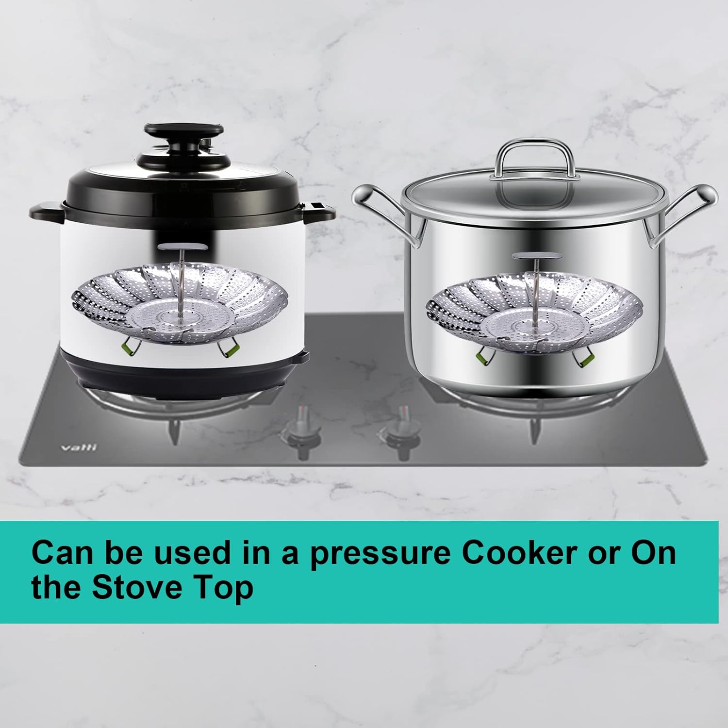 • EXPANDABLE & COLLAPSIBLE DESIGN - You can easily open and close the steamer basket. Vegetable steamer basket collapsed diameter is 5.1 inches. It expands to 9 inches once petals are stretched out. The adjustable steamer for cooking fits well in pressure cooker, pots pans with 3, 5, 6 quarts capacity. The metal steamer basket blades can be folded compactly so you can save storage space than large mesh steamer basket. The holes in the steamer are easy to drain.