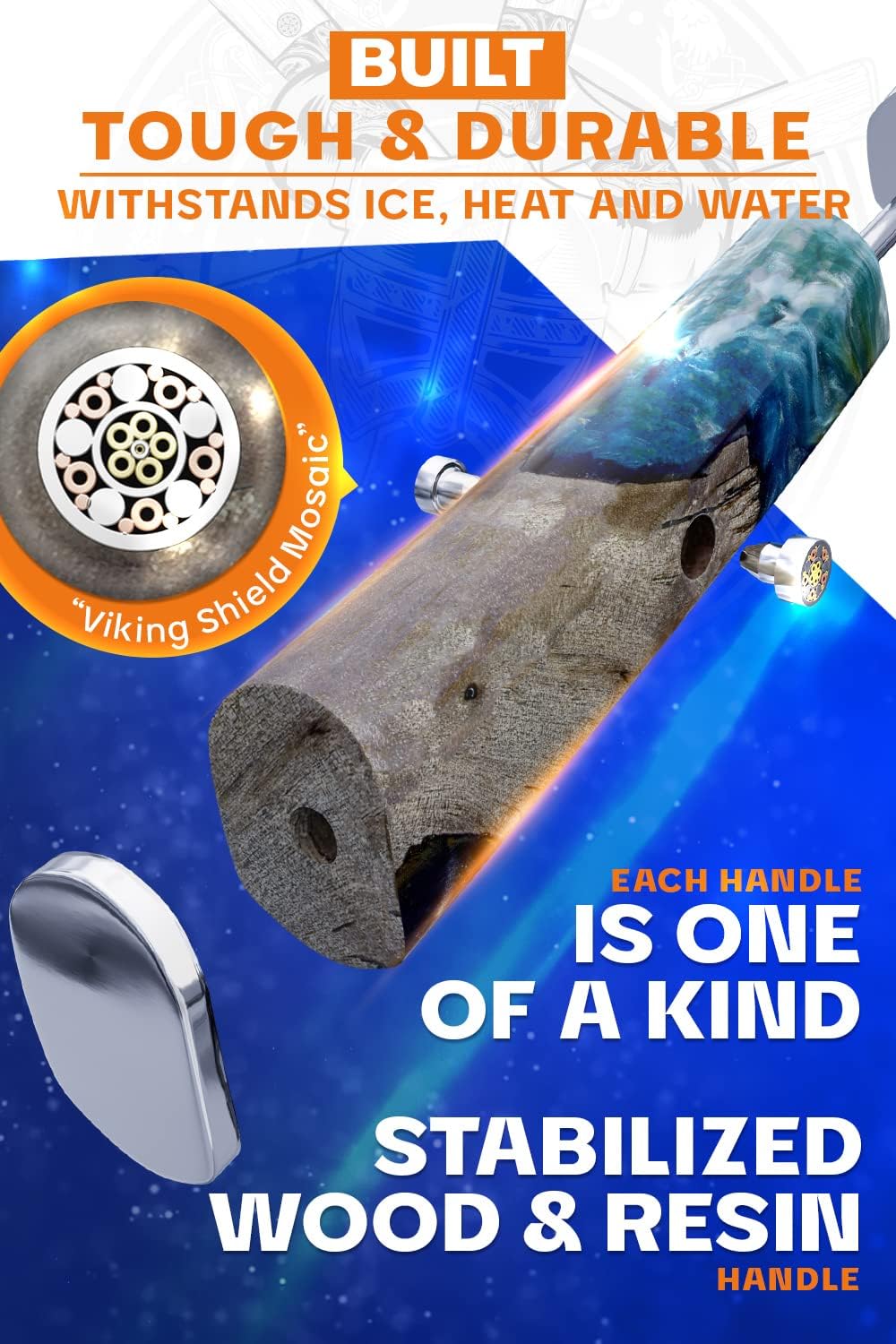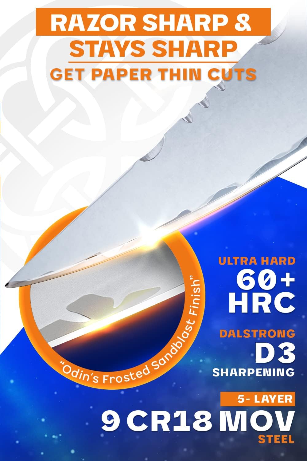 • The celestial resin handle - reinforced with stabilized wood and a stainless steel bolster - feels sturdy and turns heads with its rugged and gorgeous design. Complete with a Valhalla-embossed leather sheath, you can keep your knife protected on the go or stashed in a drawer