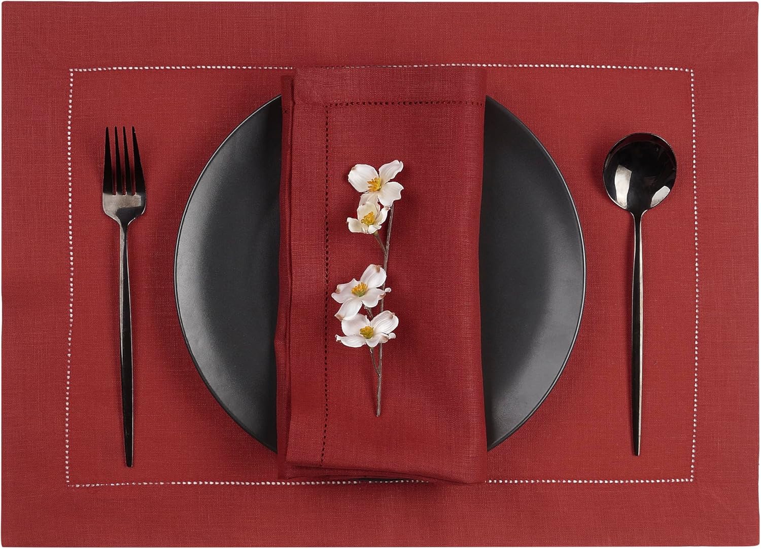 D'Moksha Homes Red Linen Placemats Set of 4 - Classic Hemstitch Placemats 14 x 19 Inch - 100% Pure Linen Table Mats for Fall, Autumn and Halloween - Handcrafted and Machine Washable