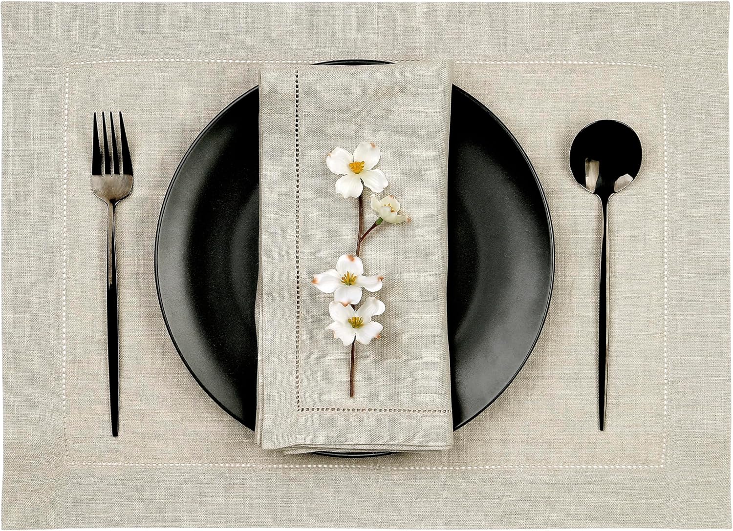 D'Moksha Homes Linen Placemats Set of 4-100% Pure Linen Natural Placemats 14 x 19 Inch - Classic Hemstitch, Washable Natural Placemats for Christmas Decor, Holiday