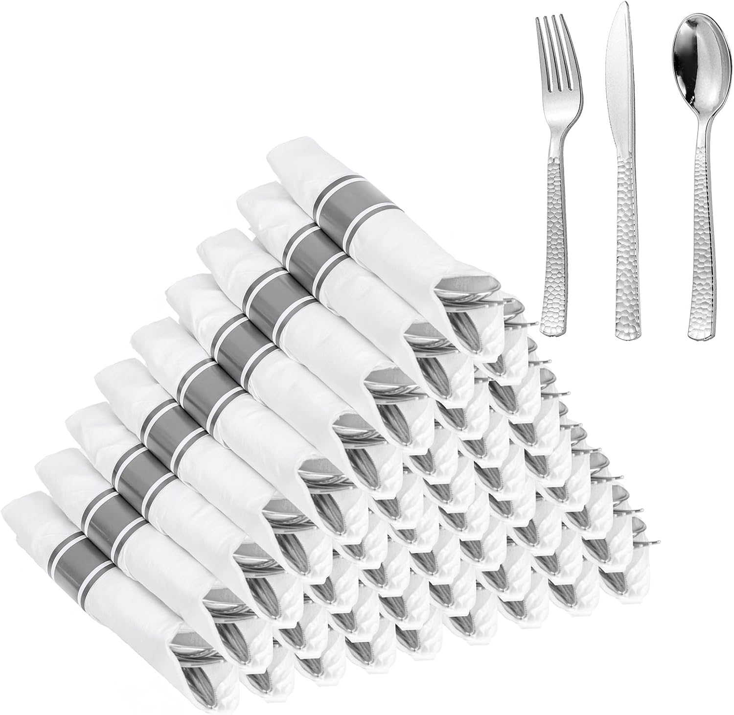 WELLIFE 50 Pack Silver Plastic Silverware with Pre Rolled Napkins,Wrapped Silverware Set Disposable,Includes:50 Forks, 50 Knives, 50 Spoons, 50 Napkins,Utensils Plastic Disposable