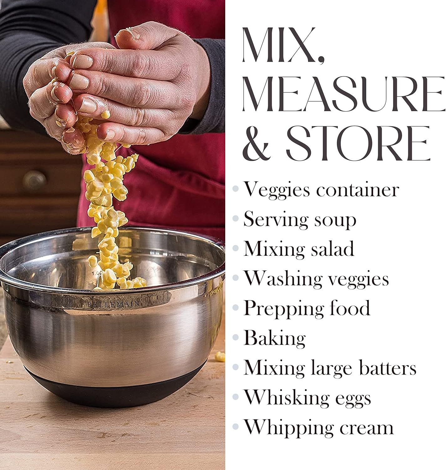 • Non-Slip Silicone, Weighted Bowl Bottoms prevent sliding for ease in mixing your favorite ingredients and baked goods.
