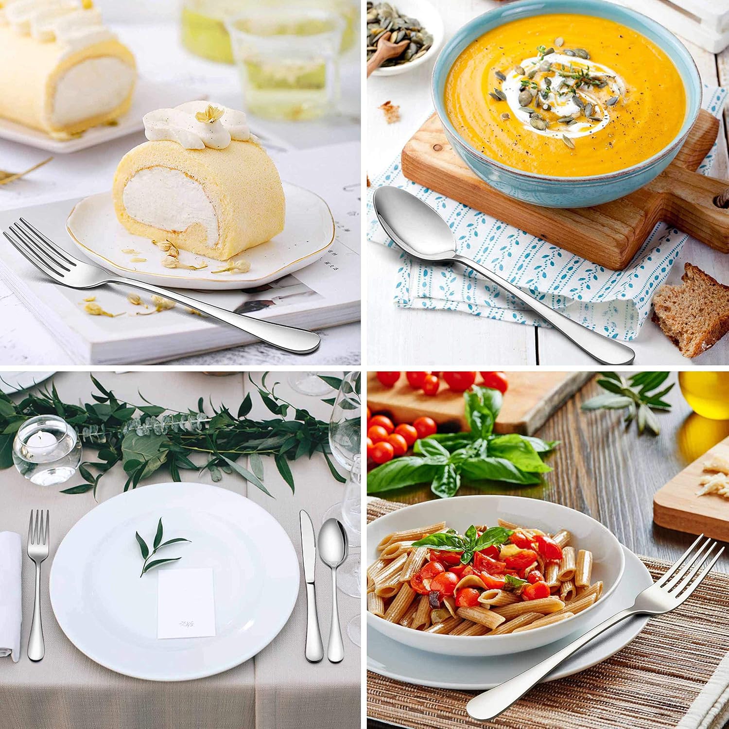 • Modern silverware, modern and classy appearance, without any redundant decoration, mirror finished keep the set shiny all the time and look as good as new, elegant flatware match well with your tableware and will provide you a fine dining experience