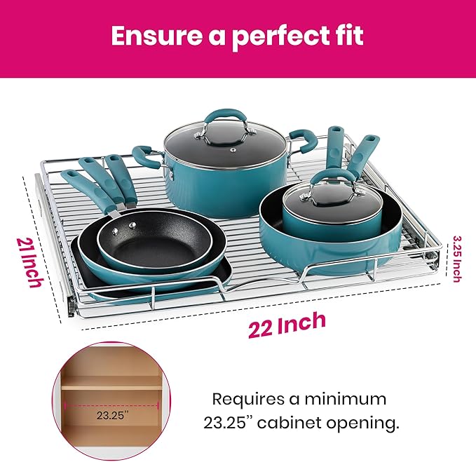 • EASY TO INSTALL & HARDWARE INCLUDED: Our pull out cabinet organizer dimensions measure 22”W x 21”D x 3.15” and includes simple step-by-step instructions along with all of the hardware necessary for easy installation. Installs with just a few simple screws, and Fits cabinet openings 23-1/4”and larger