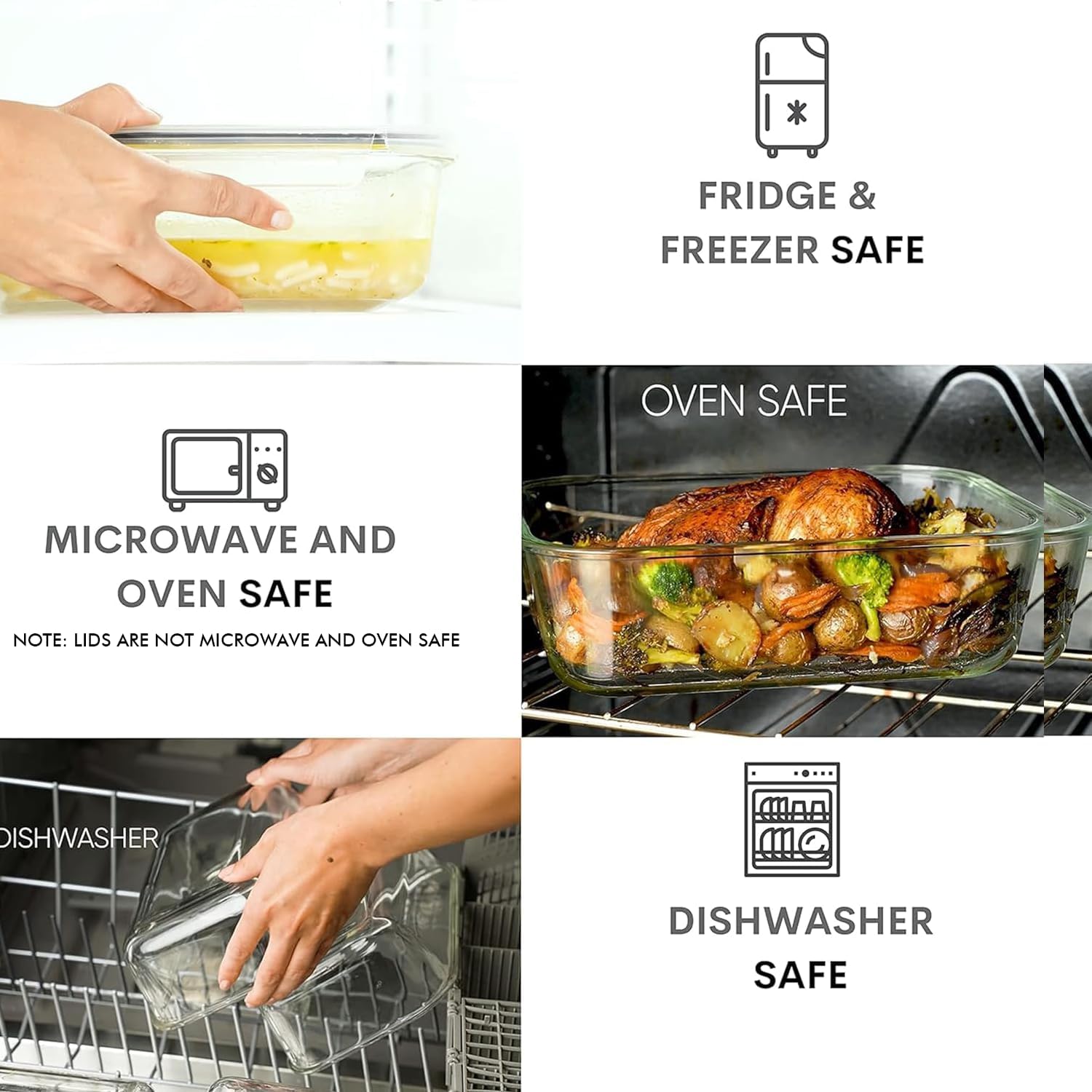 • Leak Proof Storage: Container set Is Easily Sealed, Air Tight And Spill Proof - Rectangle GLASS FOOD CONTAINERS- Keep Leftovers Fresh, Goes Straight From The Refrigerator To The Microwave Or Oven To The Table. Food Can Be Cooked Directly In The Containers Using Microwave Or Oven. Less dead space while storing in refrigerator due to Rectangle shape.