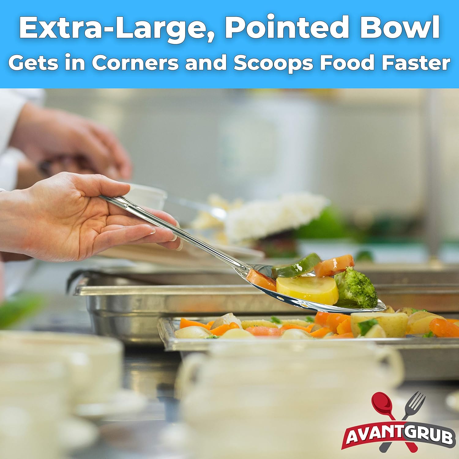 • GET MORE DONE WITH OUR EXTRA-LARGE SPOON. Our wide, deep bowl, is great for stirring or collecting juices for basting. The pointed end easily reaches into corners of pots, pans, and serving bowls, capturing product quickly and easily.