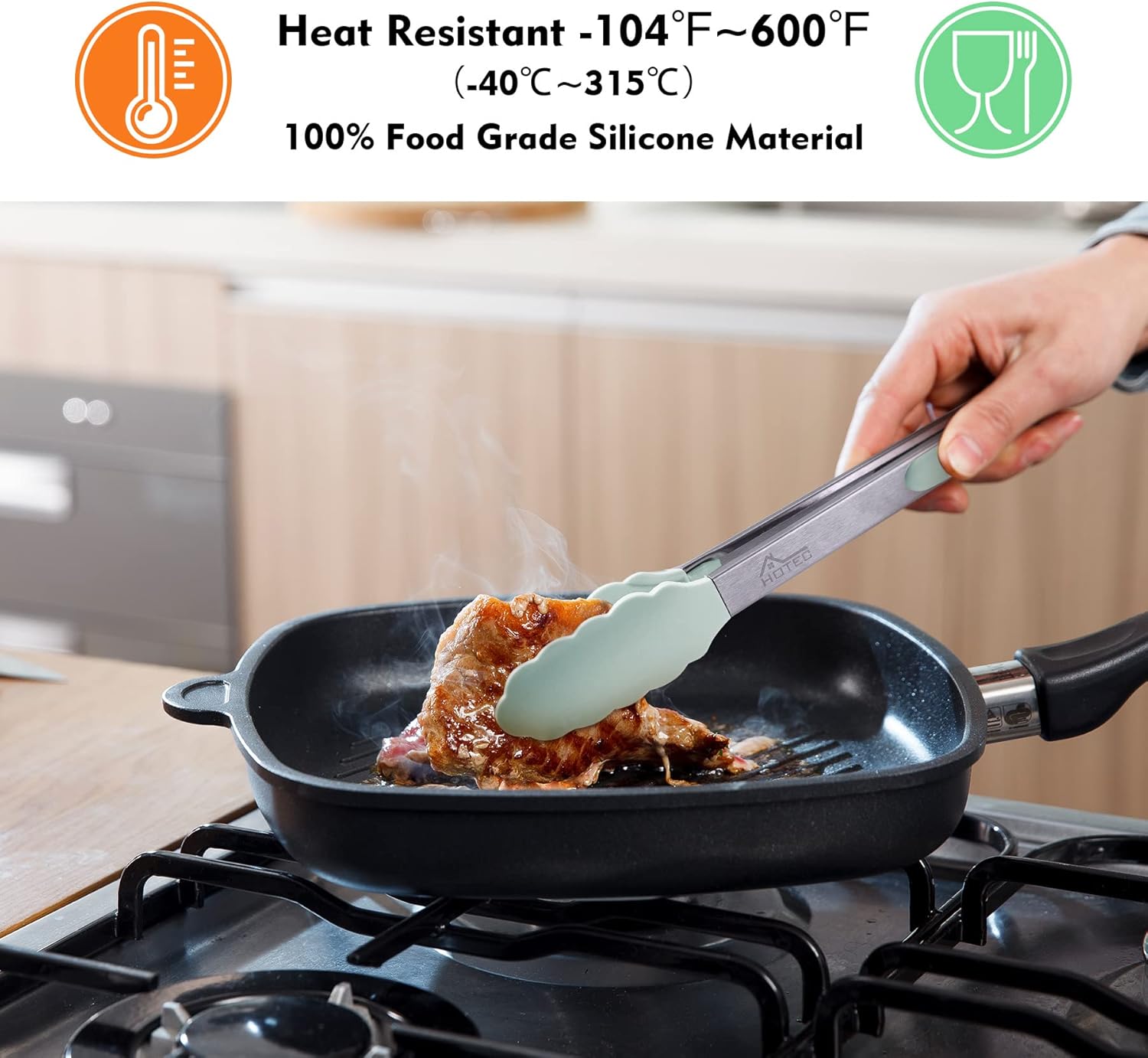• TOP QUALITY: Hotec kitchen tongs are constructed with high quality stainless steel, sturdy, heat resistance, anti-rust, anti-corrosion, light weight, easy to handle, like new forever. This tongs for cooking comes with 2 sizes, 9 inch and 12 inch.