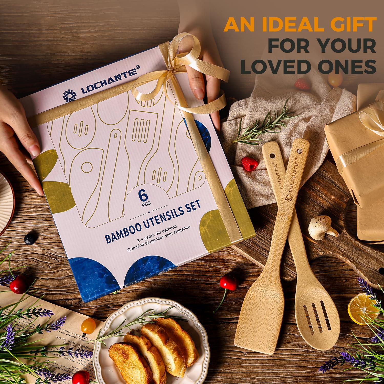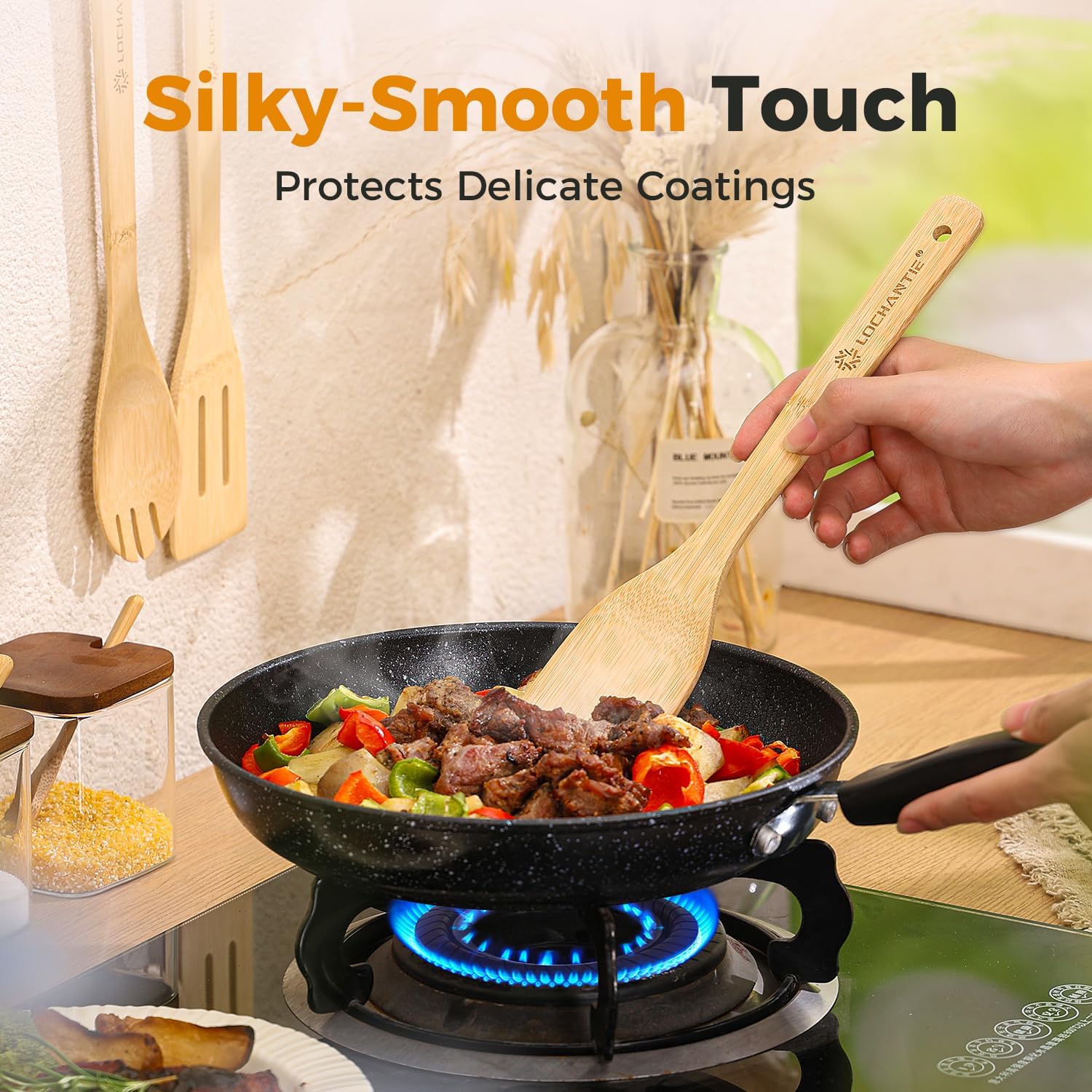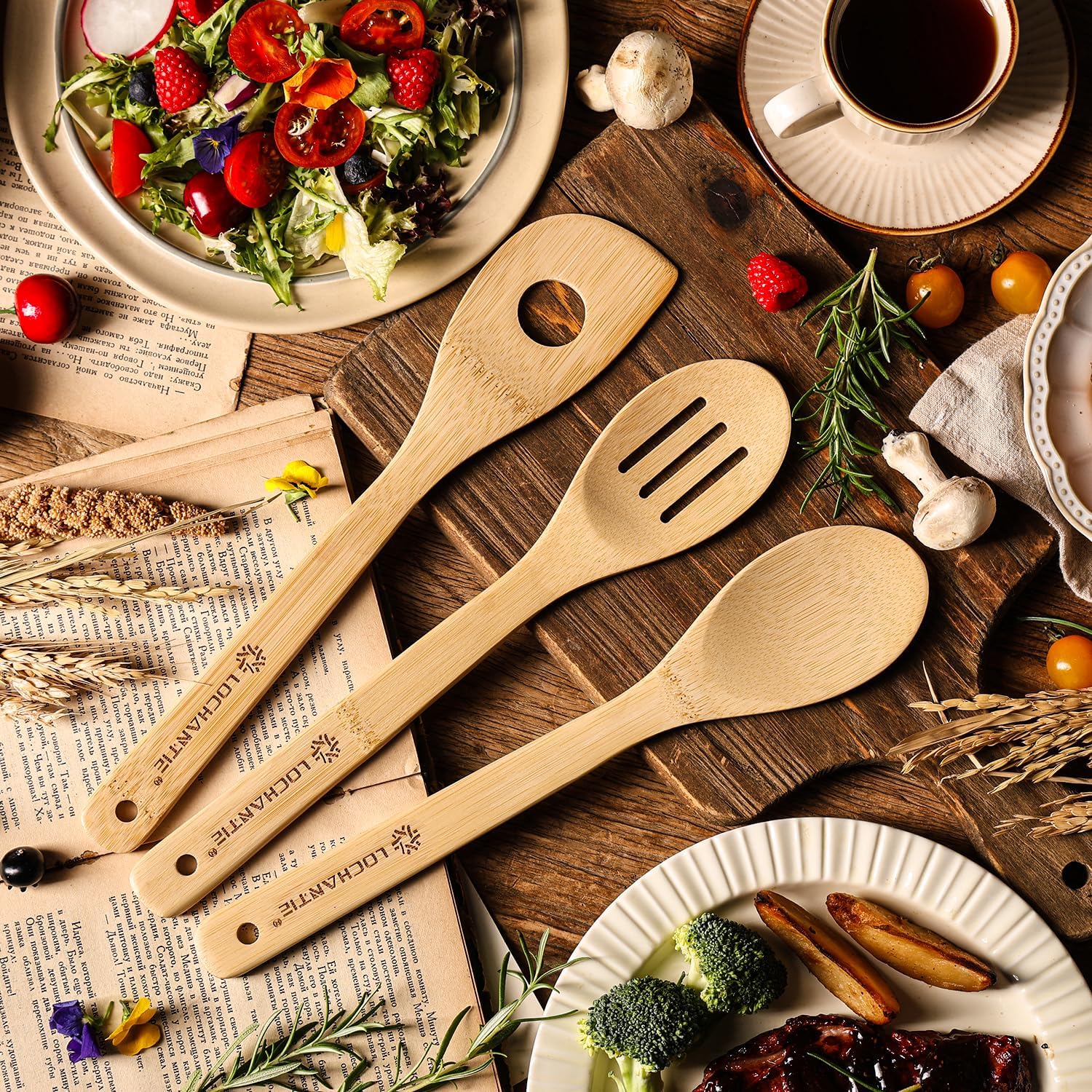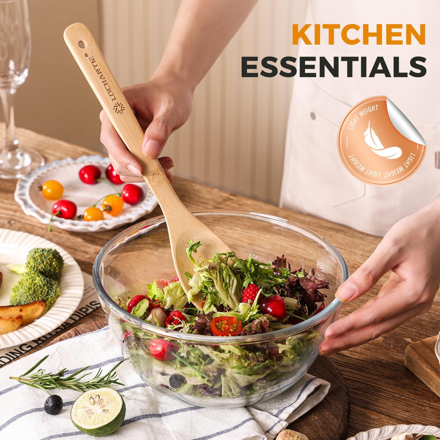 • ✔PREMIUM NATURAL BAMBOO – SAFE & ECO-FRIENDLY: Crafted from high-quality natural bamboo, which offer a safe and sustainable alternative to plastic or metal kitchen tools