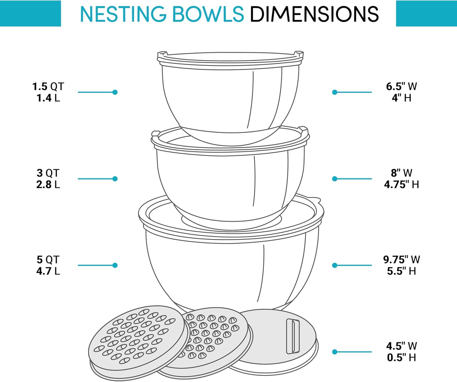 • EASY TO CLEAN / NESTS - Stainless steel mixing bowl sets are super easy to clean by hand. The bowls are dishwasher safe too (not the lids). Now that they're washed, you want them neatly out of the way. No problem, these kitchen bowls stack perfectly.