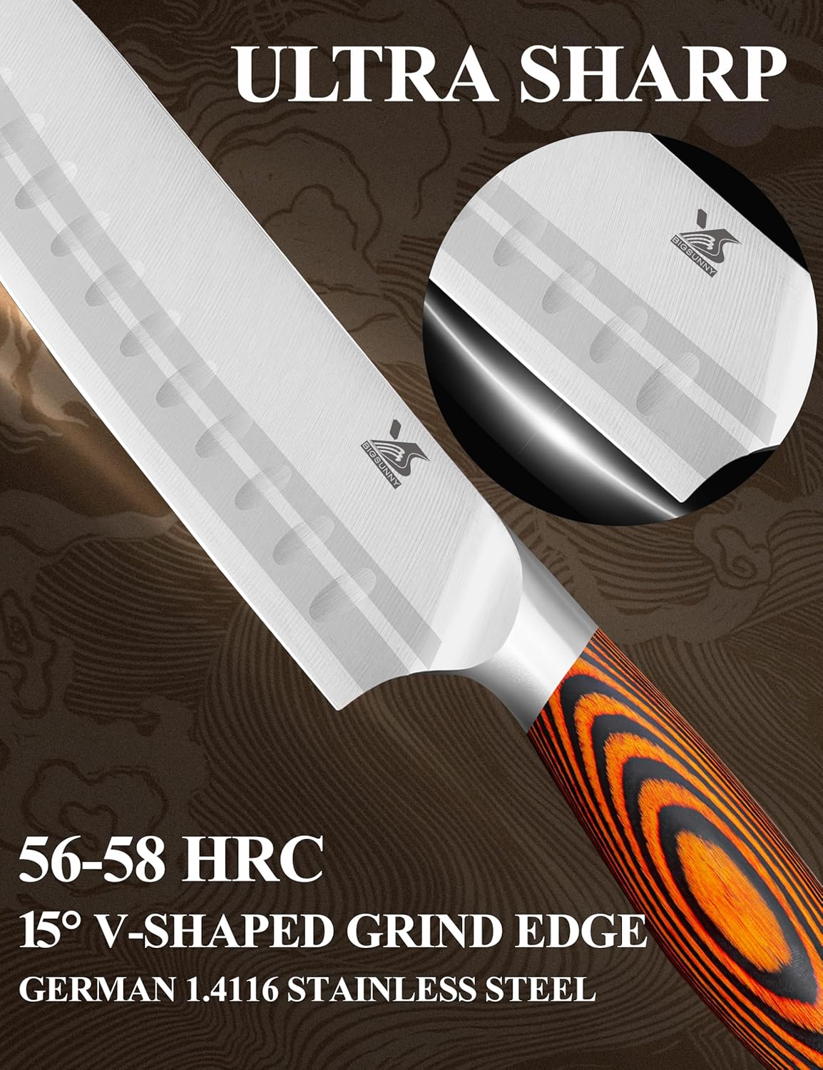 • 【Ergonomic Design】Pakkawood handle for a durability yet balanced and comfortable grip. Every curve and angle of the handle is ergonomically designed for a comfortable and ambidextrous hold. The shape of the blade also brings you a minimal slicing resistance. Most importantly, excitement back to cooking.
