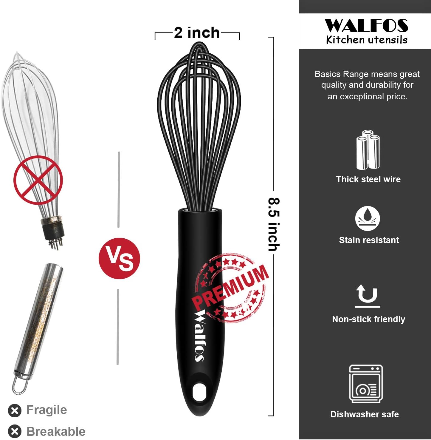 • 8.5in/21.5cm Silicone whisk: Walfos Whisk are widely used in daily life and are a good helper for beating eggs, butter, powdered sugar, whipped cream, etc. Melt chocolate, stir pancake batter, stir sauces, and more. Essential utensil for kitchen whether at home or restaurant. Balloon Whisk. use small ones for stirring meat sauces, salad dressings, etc.use the big ones for mixing batters, whipping cream and more.