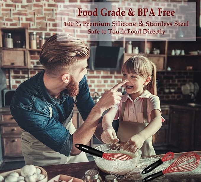 • HIGH PERFORMANCE STURDY AND SAFE:Walfos Silicone Whisks for cooking non scratch allows to withstand high heat resistant up to 480℉. Our non stick whisk for vigorous whipping and aerating while making your favorite foods. 3 different sizes - 7 inch, 9 inch and 11 inch, they will meet all your diverse cooking needs