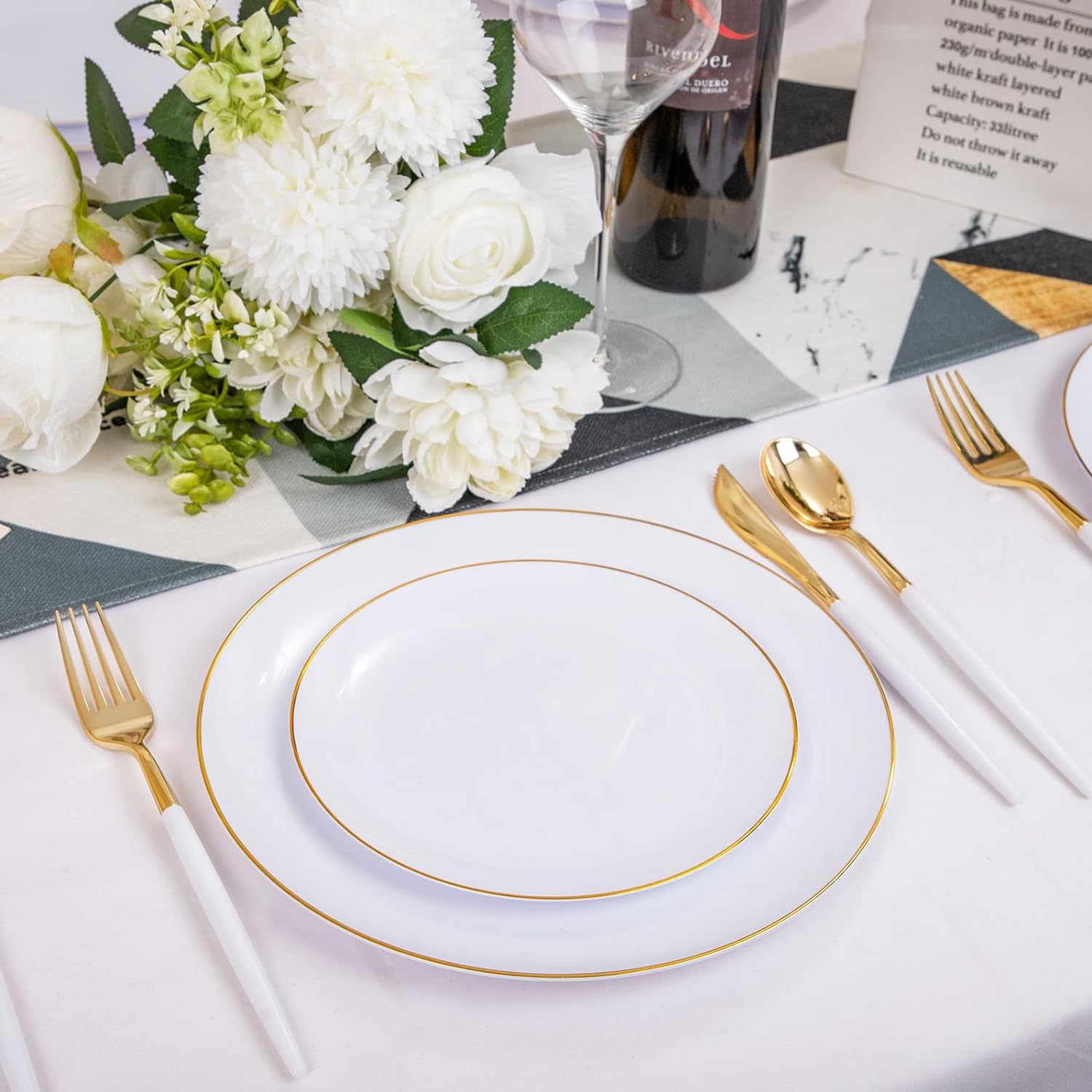 • STYLISH AND ELEGANT: An elegant event needs to be decorated with delicate and fashionable plates. The combination of white and gold, the collision of simplicity and nobility, impressing friends and family with your lavish gold plastic disposable plates and silverware.