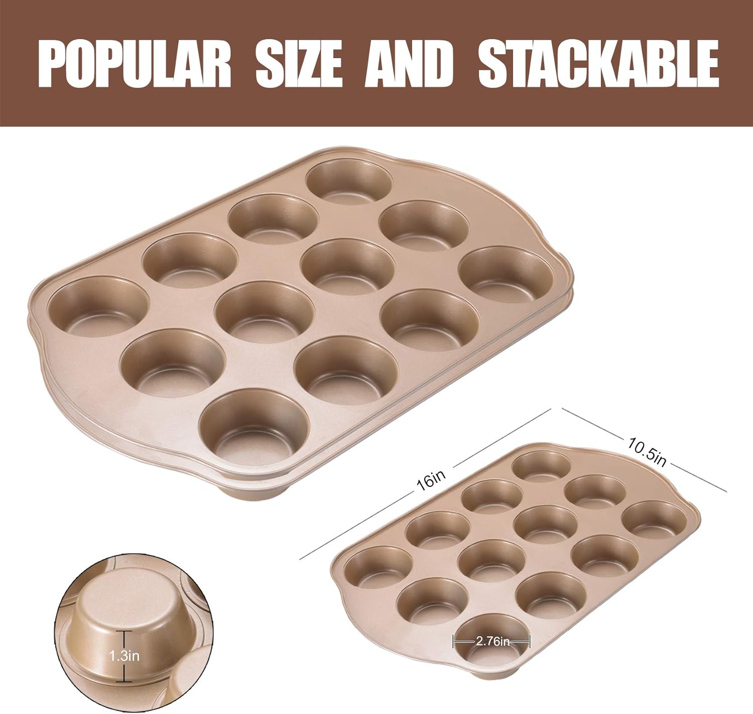 • 2-PACK 12-CUP MUFFIN PANS SET WITH SPACE-SAVING DESIGN :Each muffin pan set includes 2 muffin pans (12 cups regular size each), designed with stackable champagne gold tins for compact storage. The ergonomic handles provide a secure grip, while each cup’s 2.76” diameter ensures perfectly sized muffins, cupcakes, or mini quiches.