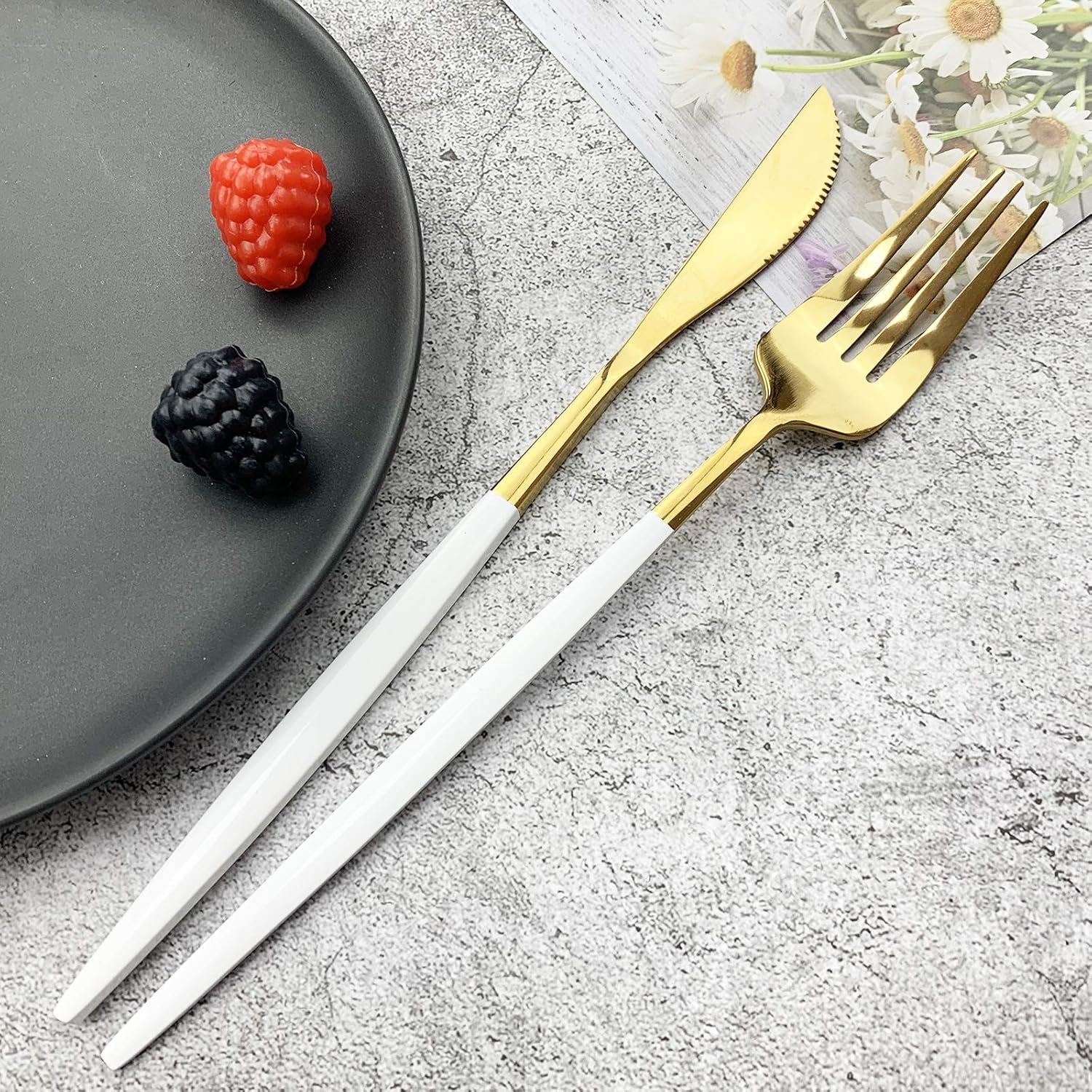 JASHII 18/10 Silver Silverware Set Stainless Steel Flatware Utensils Set Gold Cutlery Set| 24-Piece Modern Cubiertos Dorados| BEST Birthday Wedding Gift (4 sets, White Handle Gold Mirror Polish)