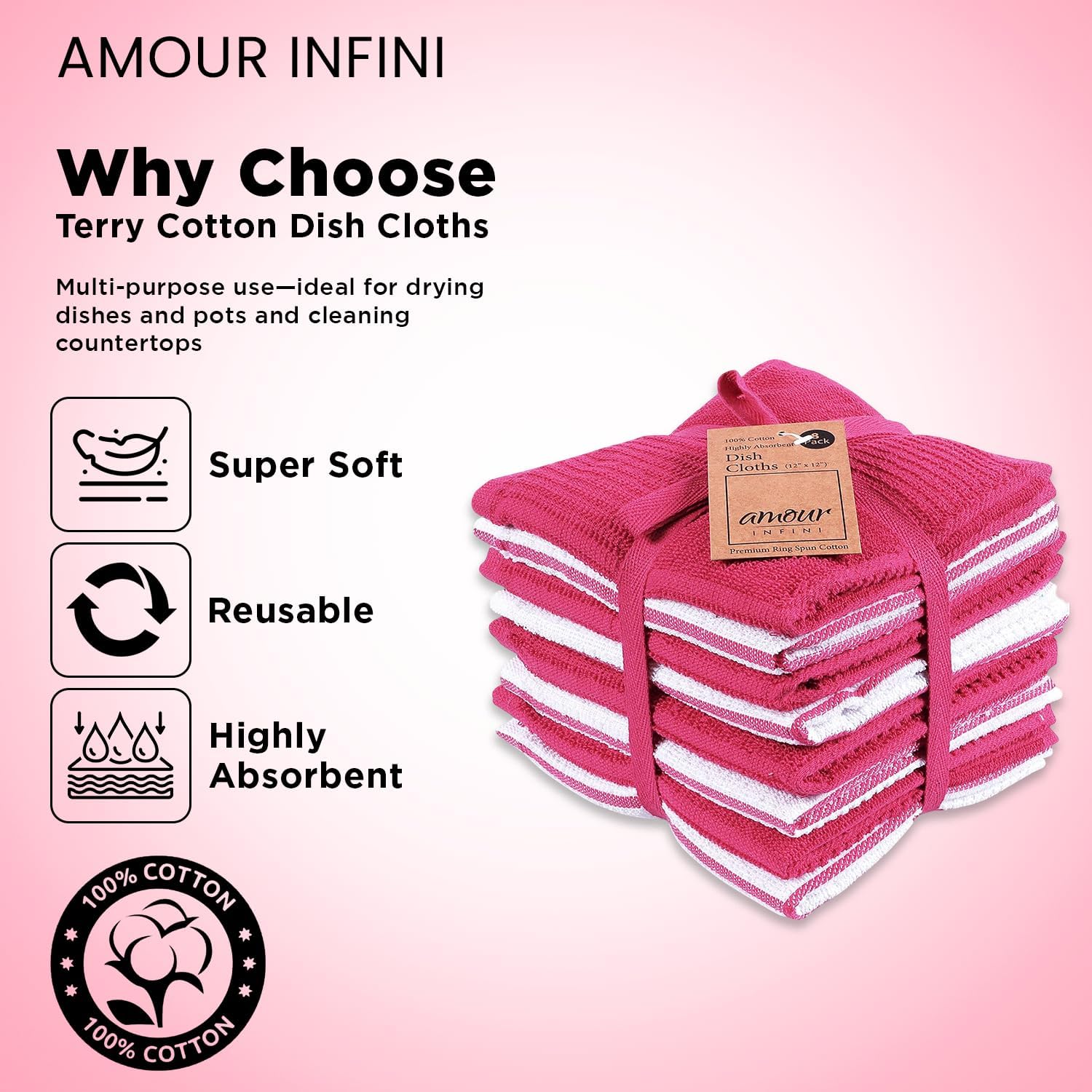 AMOUR INFINI Dish Cloths for Washing Dishes Set of 8 - Highly Absorbent, Super Soft Kitchen Dishcloths - Reusable Quick Dry Dish Rags for Cleaning & Drying Kitchen Linens (12x12 Inch - Pink)