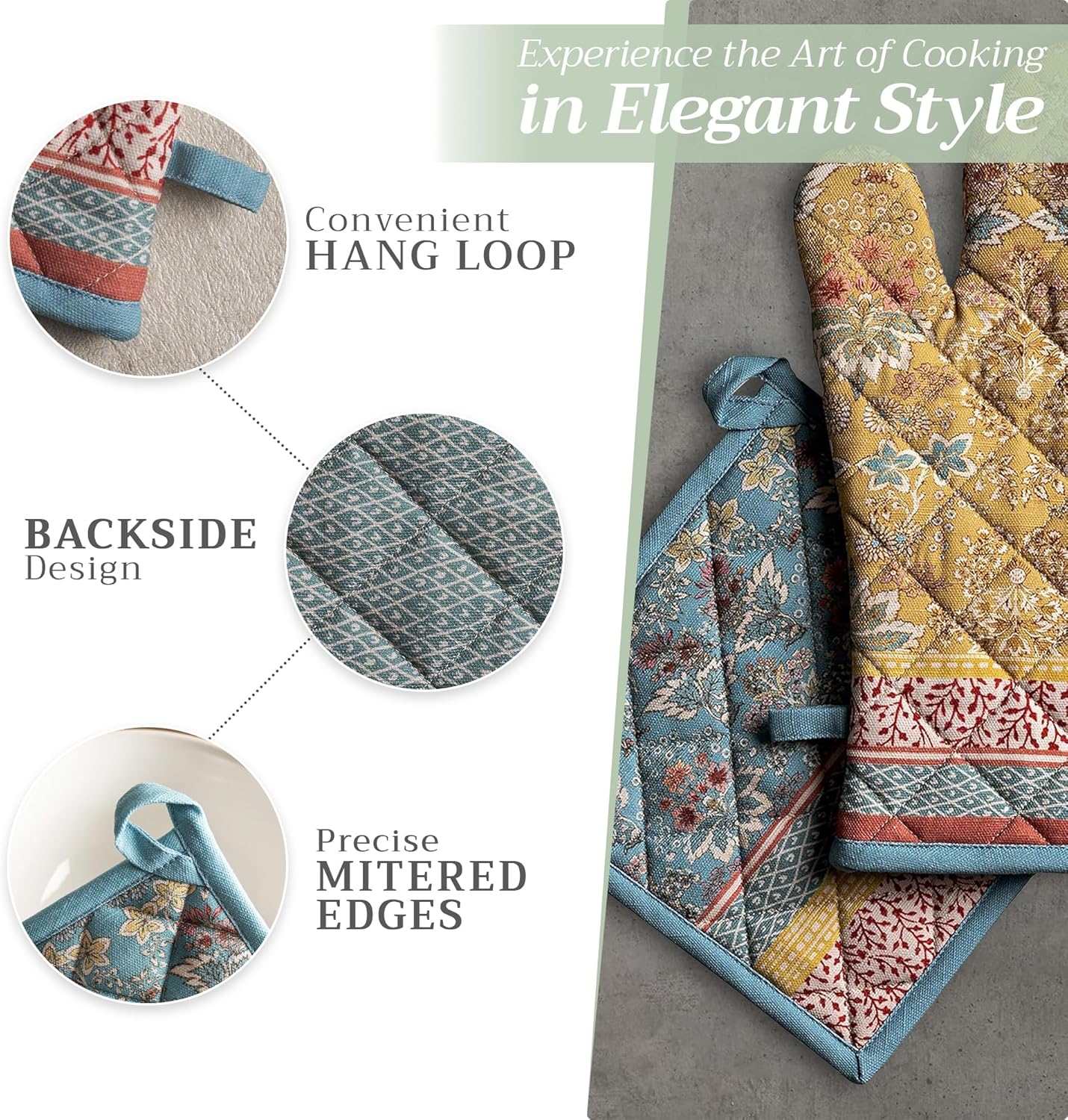 • Premium Quality: Crafted from quilted 100% cotton, this heat resistant oven mitt and pot holder set offers comfort, flexibility, and protection from hot cookware. Ideal cotton oven mitts for daily kitchen use and cooking safety