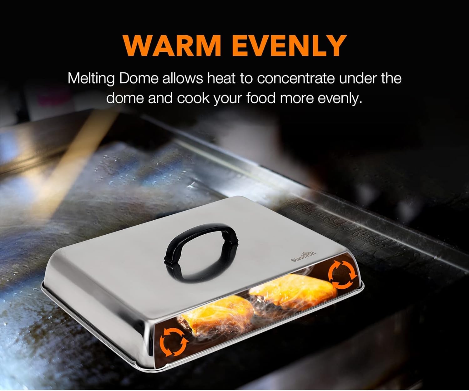 • MELTING DOME: Measures 14.2"L x 11.2"W x 2.6"H, made from heavy-duty stainless steel, perfect for concentrating heat to cook evenly, melt cheese, steam vegetables or roast. Healthy choice for your daily cooking.