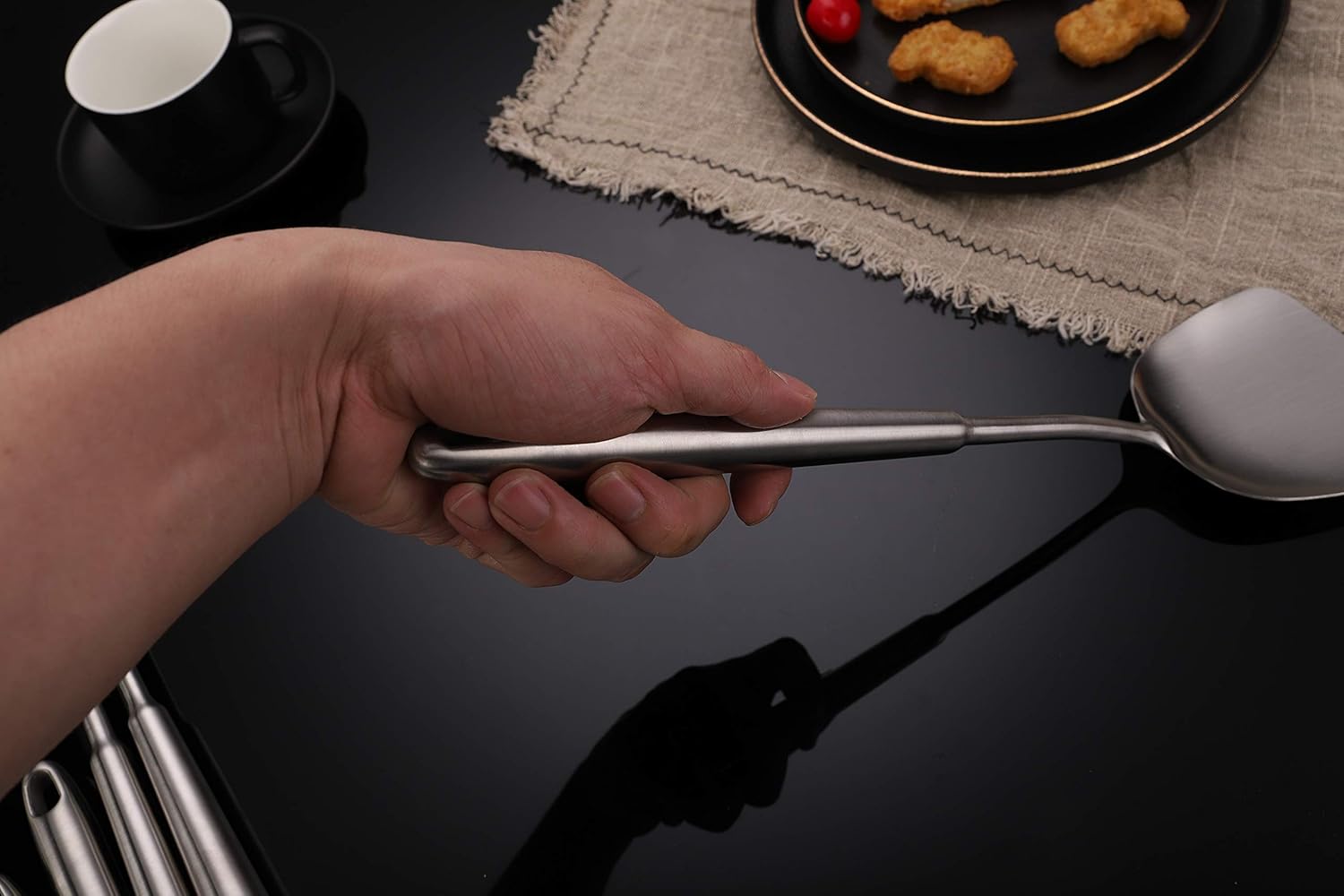 • Hollow handle and ergonomic design: Heat resistant and ergonomic designed handle easy-to-hold. It allows you to handle your food conveniently , reduce hand fatigue and minimize the risk of slipping. The handle won't hold bacteria and rot like wood , which means healthier cooking. It also will hold up to the demanding use of home cooks and professional chefs.