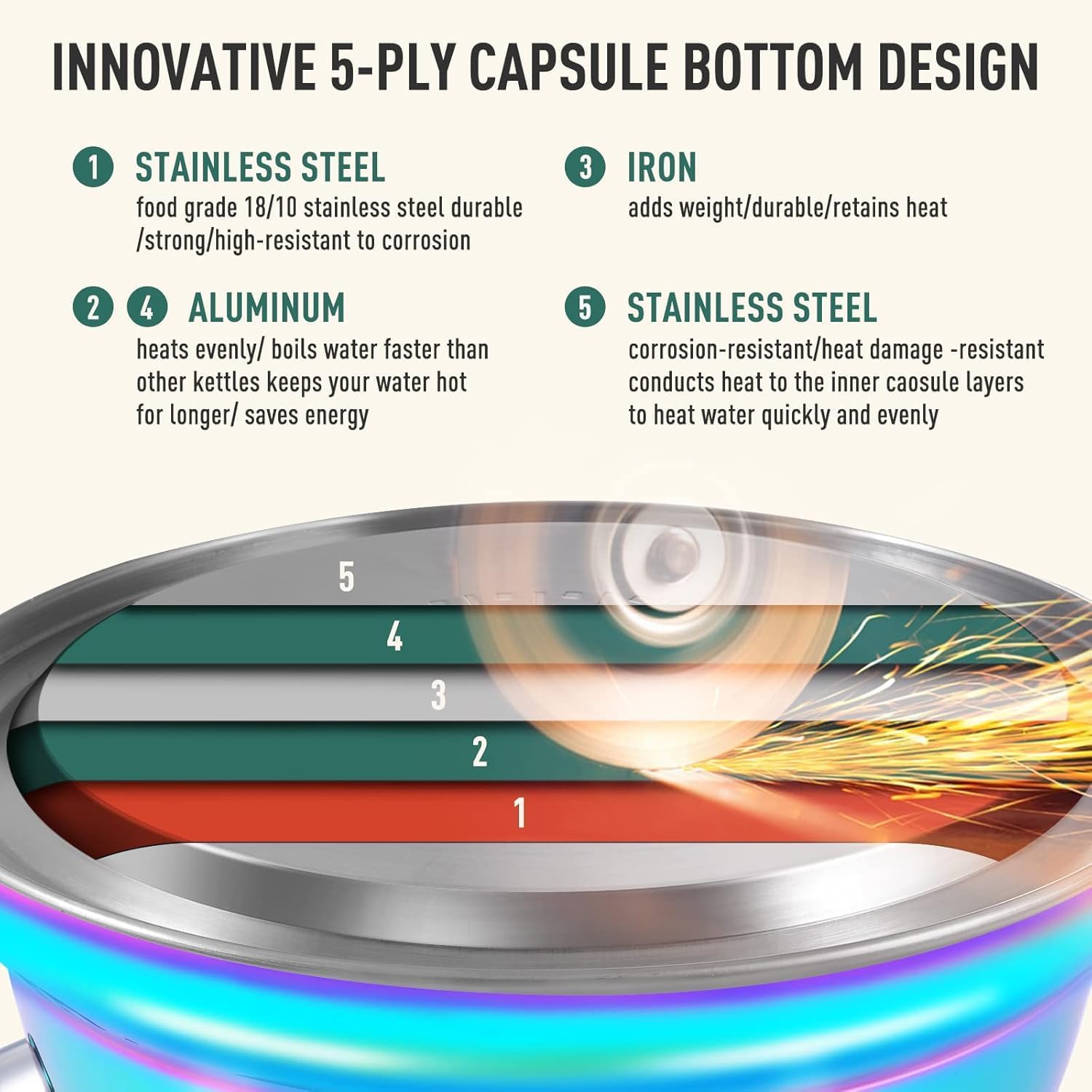 • INNOVATIVE 5-LAYER BOTTOM: Our kettle is specially developed with a 5-layered base to enhance heating performance, boil the water more quickly than other tea pot and save your time & energy. High quality teapot is not afraid of falling.