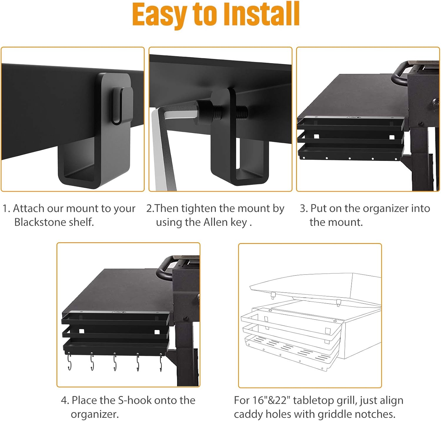 • Easy to Install: The grill caddy is user-friendly and can be installed easily. Our Blackstone griddle caddy is approxmately 13"x4.9”x4.3", it is stylish and keeps the tabletop less cluttered, package included: 1xBlackstone Griddle Organizer, 5xS-hooks, 2 x metal mounts, 2 x screws, 1xAllen key. 1-year replacement service.