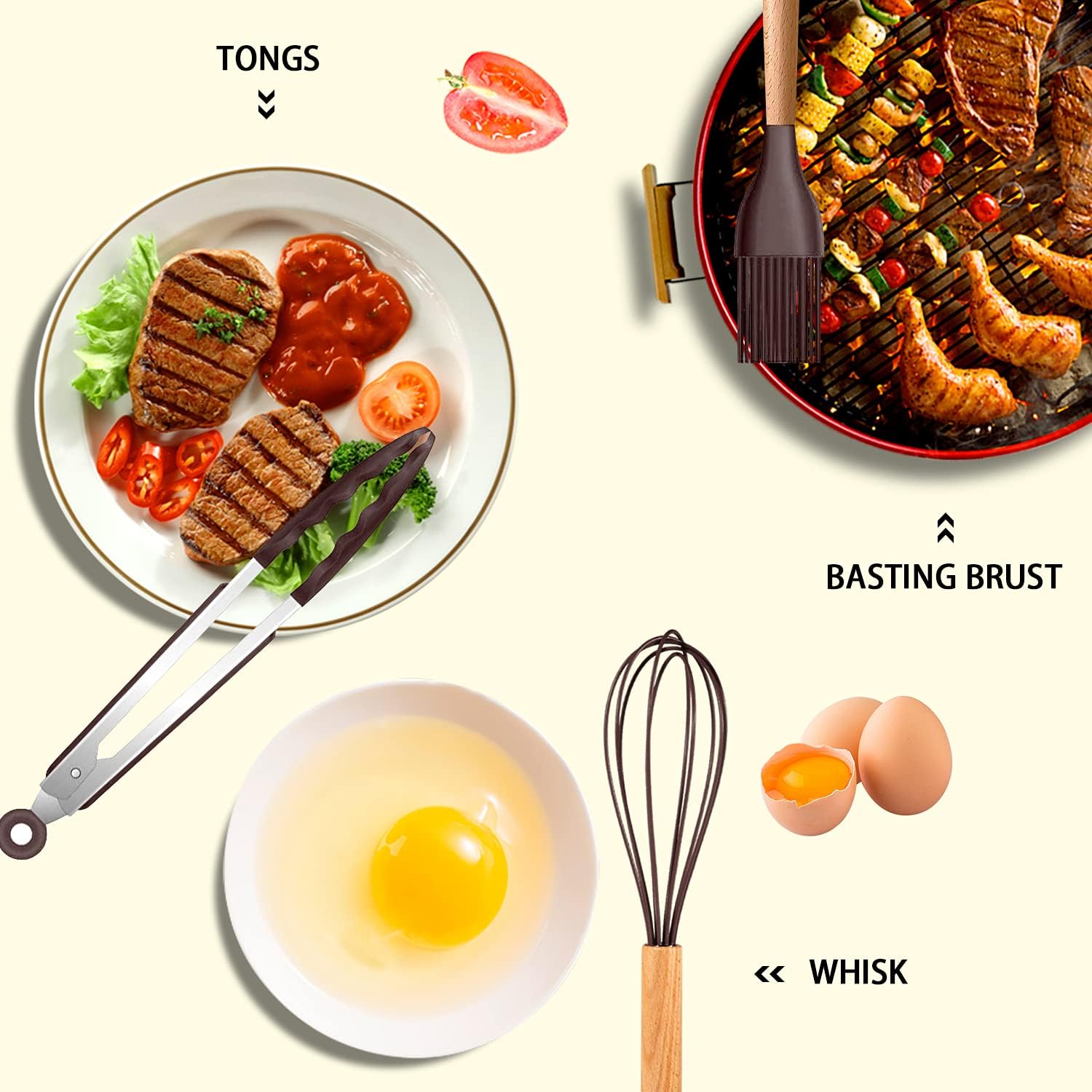 MIBOTE Silicone Cooking Kitchen Utensils Set with Holder, Wooden Handles BPA Free Non Toxic Silicone Turner Tongs Spatula Spoon Kitchen Gadgets Utensil Set for Nonstick Cookware (Coffee)