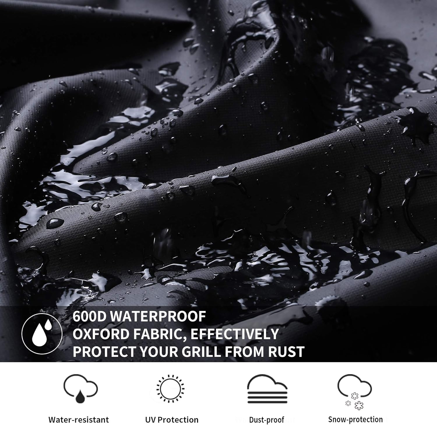 • Upgraded Material- This grill cover made of upgraded heavy duty waterproof special fade resistant 600D polyester oxford fabric with waterproof PVC coating, effectively preventing water, dust and snow. Our cover will give your grill all year round protection against all elements.