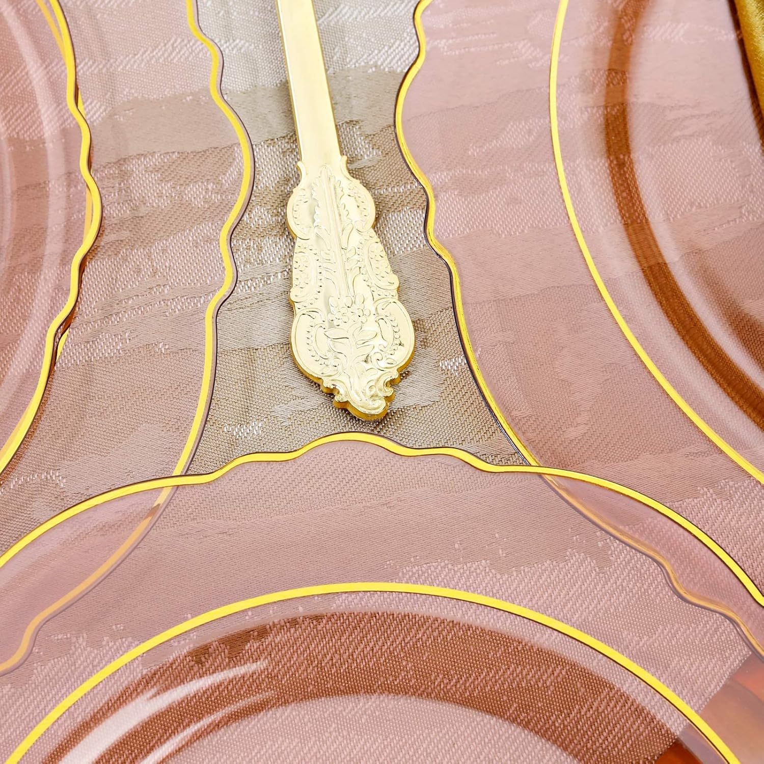 KIRE 210Pcs Clear Pink Plastic Plates with Gold Rim - Disposable Gold Silverware &Pink Cups&Hand Napkin - Plum Colored Plastic Dinnerware for Upscale Wedding