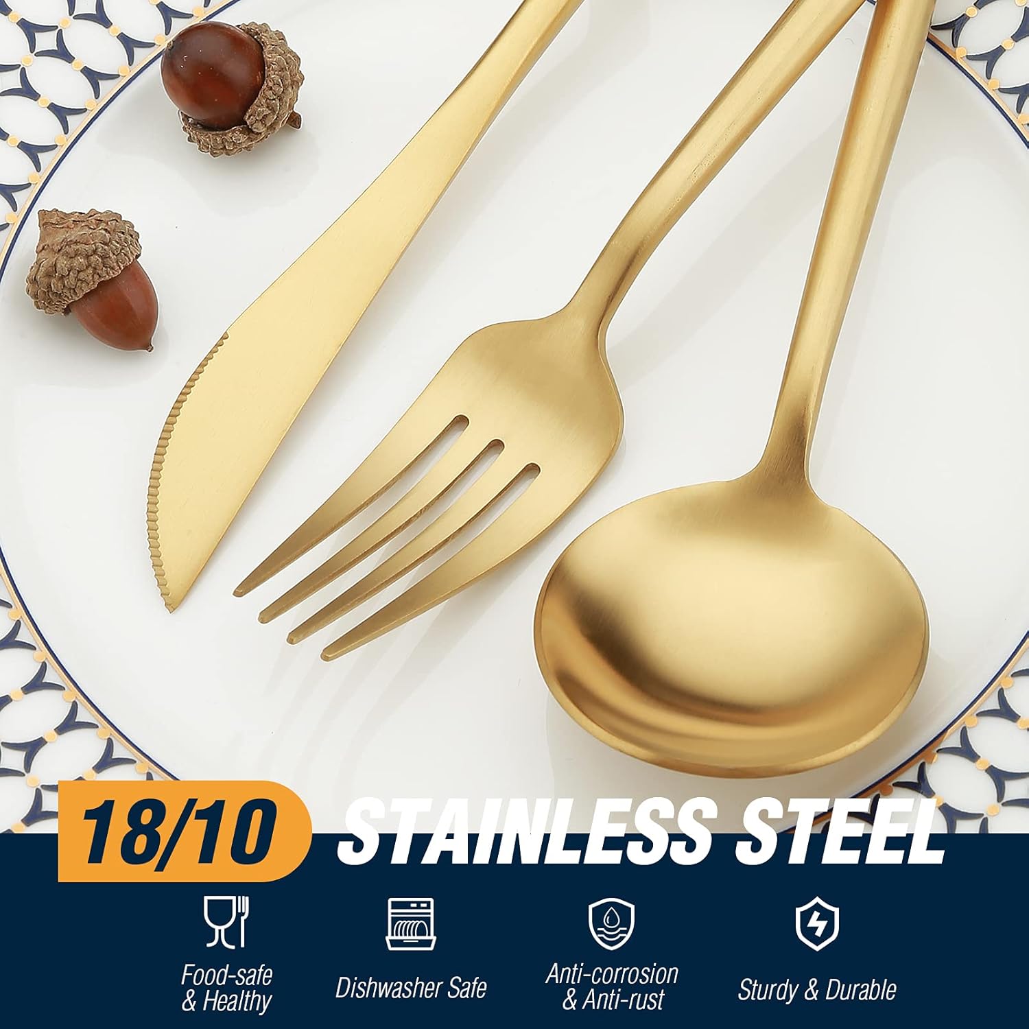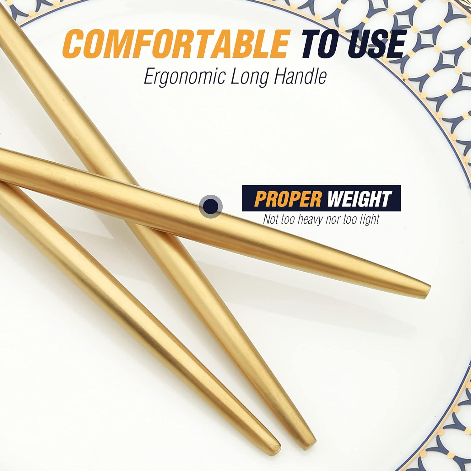 • 【Stainless Steel】This golden eating silverware set is made from premium stainless steel material, with no sharp edges, stylish and extraordinary, round and sleek lines, especially the edges where your fingers hit are smooth for safe use.