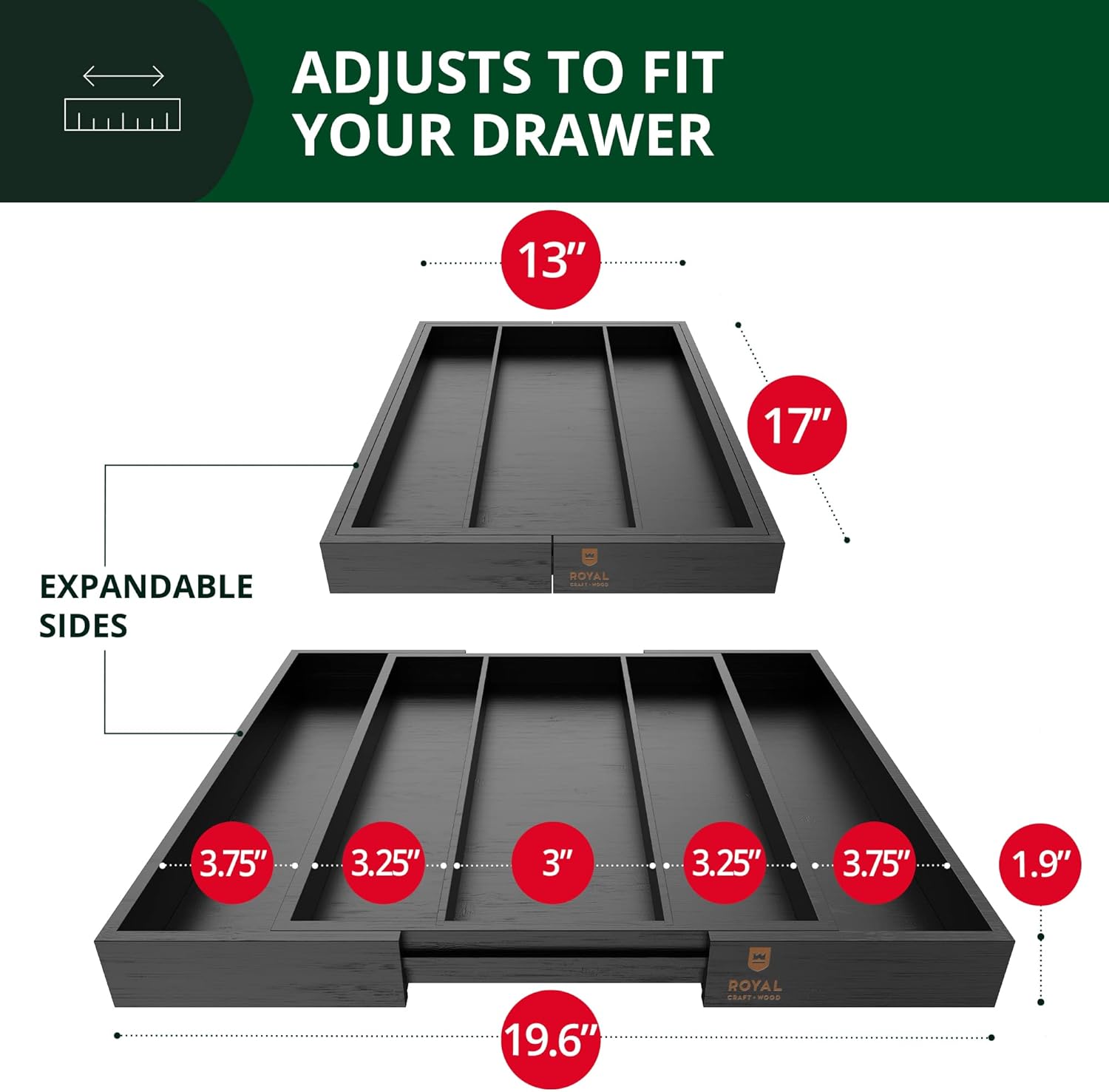 • 📐𝑴𝑬𝑨𝑺𝑼𝑹𝑬 𝒀𝑶𝑼𝑹 𝑫𝑹𝑨𝑾𝑬𝑹 𝑩𝑬𝑭𝑶𝑹𝑬 𝑷𝑼𝑹𝑪𝑯𝑨𝑺𝑬: Please be aware that the Royal Craft Wood Silverware Organizer is a bit deeper and larger than some kitchen drawers. We kindly ask that you MEASURE your home drawer prior to purchase to ensure that this product is a good fit. Please ensure that your drawer space intended to be used with the drawer organizer is LARGER than 20x18” wide for a guaranteed, comfortable fit when fully expanded