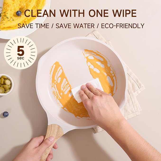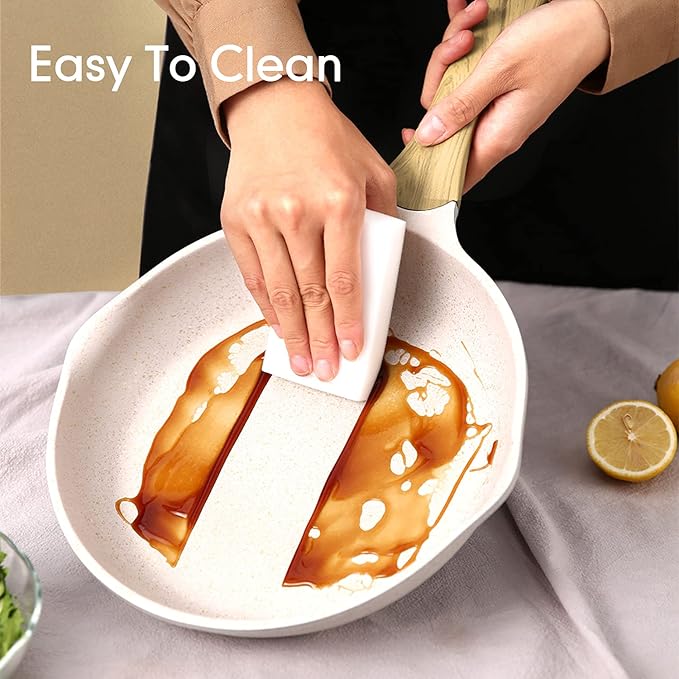• 【Super Easy To Clean】Our non-stick frying pan cleans up in seconds, the eco-friendly coating makes cleaning a breeze, wipe it with a paper towel or rinse it with a little water. Hand washing is recommended to maintain coating longevity