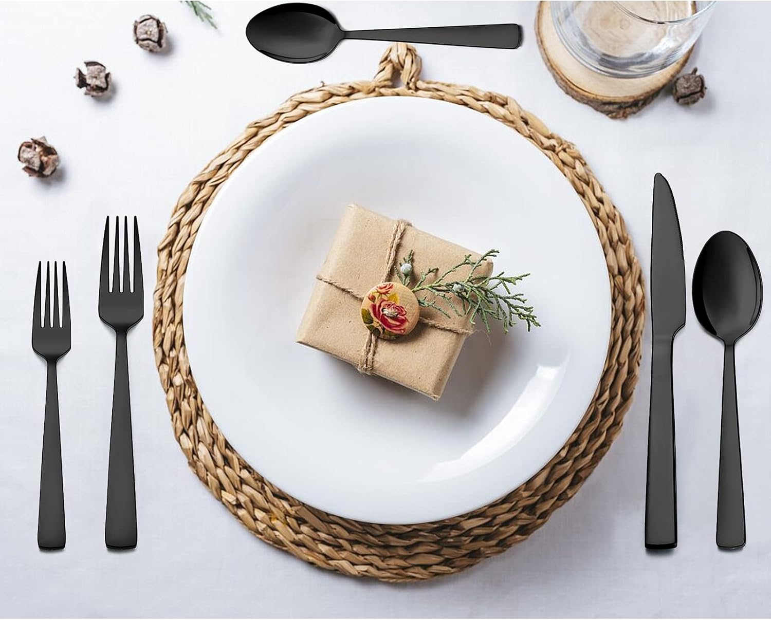 • SERVICE FOR 8: 40pcs black square silverware set includes 8 dinner knives, 8 dinner forks, 8 dinner spoons, 8 salad forks and 8 teaspoons.