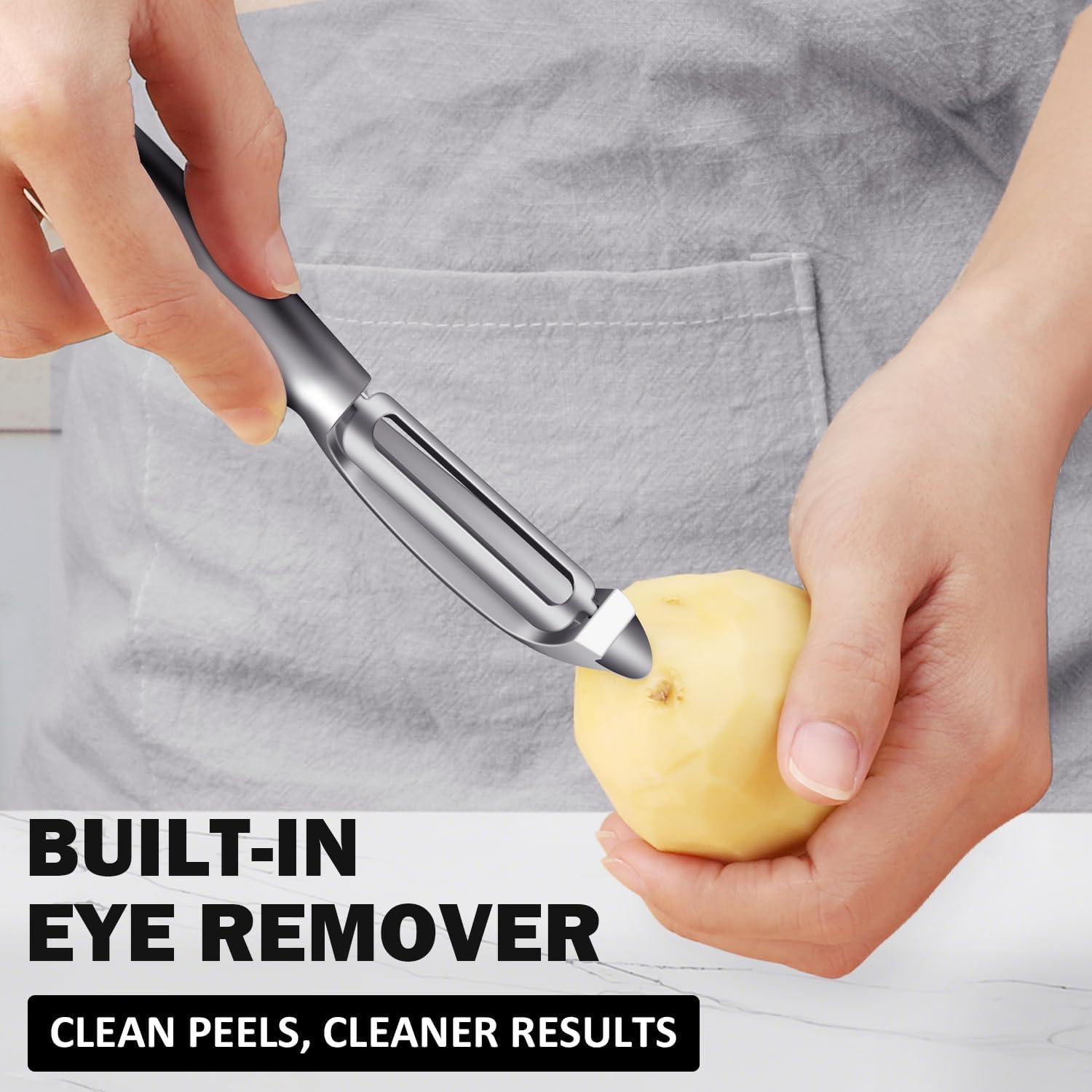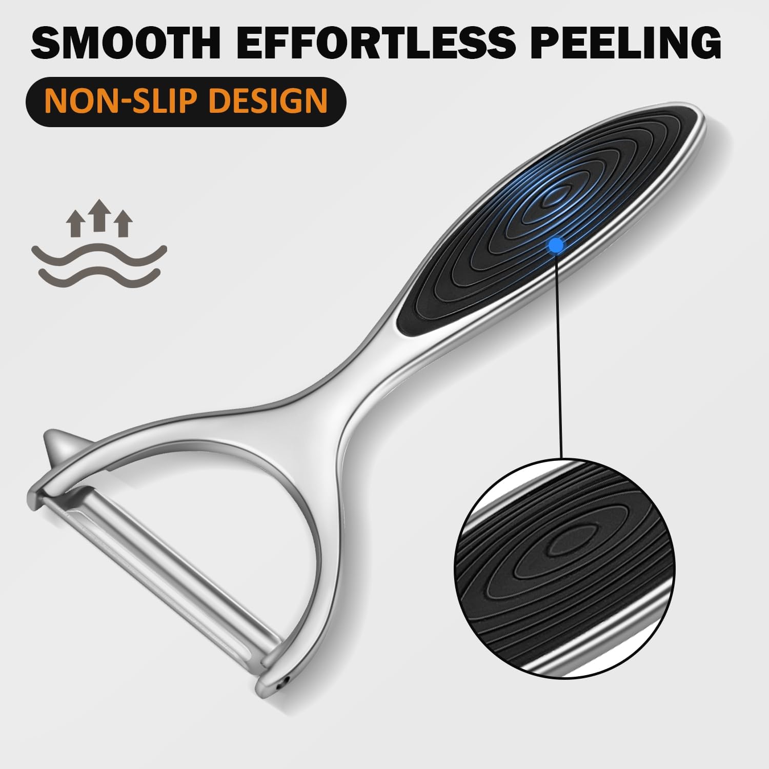 • Upgrade Quality Material: Use upgraded rust free carbon steel blade and zinc alloy body makes it rust-free. The blade is hard which better than ordinary stainless steel. Quickly removes tough skinned fruits and vegetables.