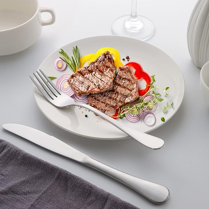 • Superior quality, forks and spoons silverware set is made of high quality food grade stainless steel, resist rust and corrosion, solid and sturdy structure will not bend or chip after heavy use, durable enough to serve you well for years to come
