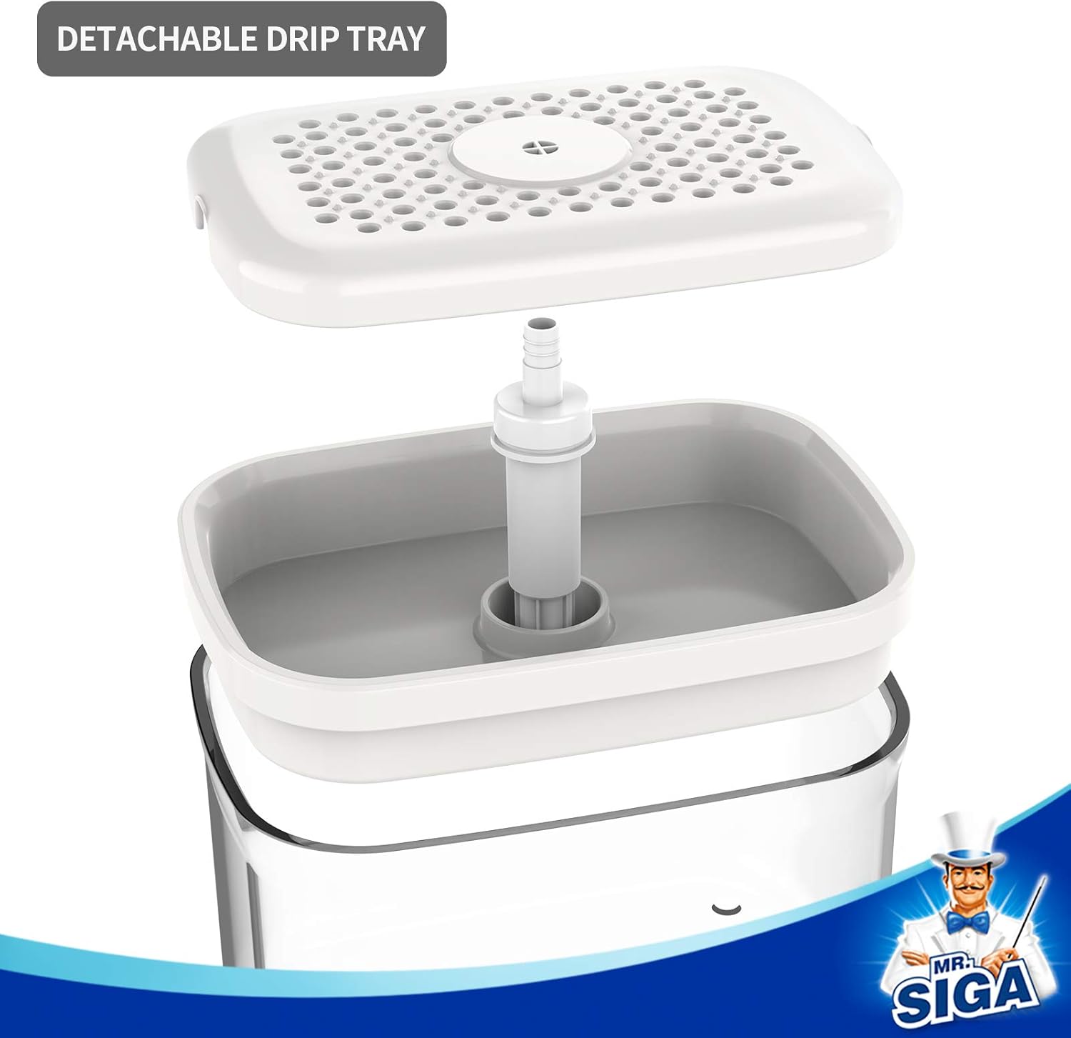 • DETACHABLE DRIP TRAY CATCHES RESIDUAL LIQUID: Detachable 2-piece white tray allows for convenient cleaning. Built in solid dots on the tray top generate non slip experience while pumping with sponge. Ventilated holes allows for drying sponge, scouring pad fast, drip tray catches residual liquid and has pour spout for easy pouring.