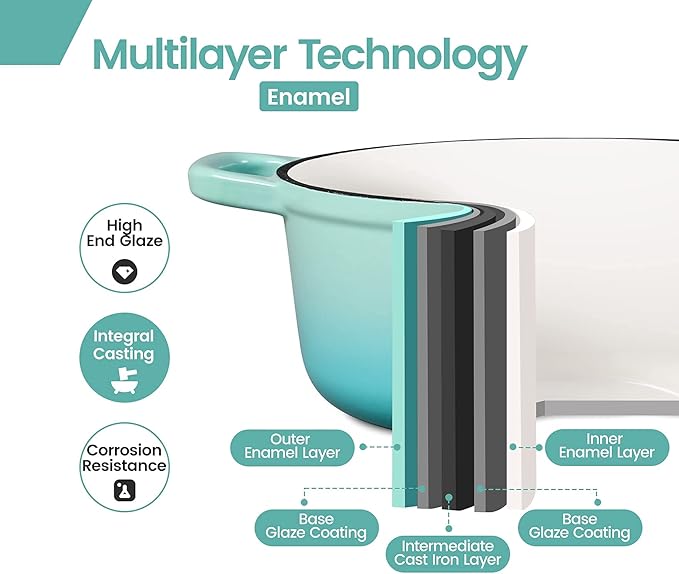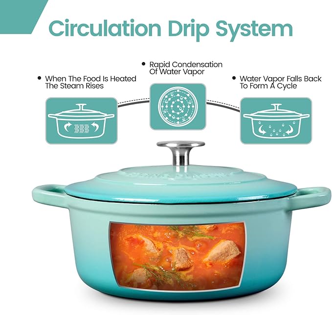 • Suitable for 6-7 people: The 5.5 quart enamel Dutch oven is the choice for cooking food and desserts. Its design makes your food look more delicious