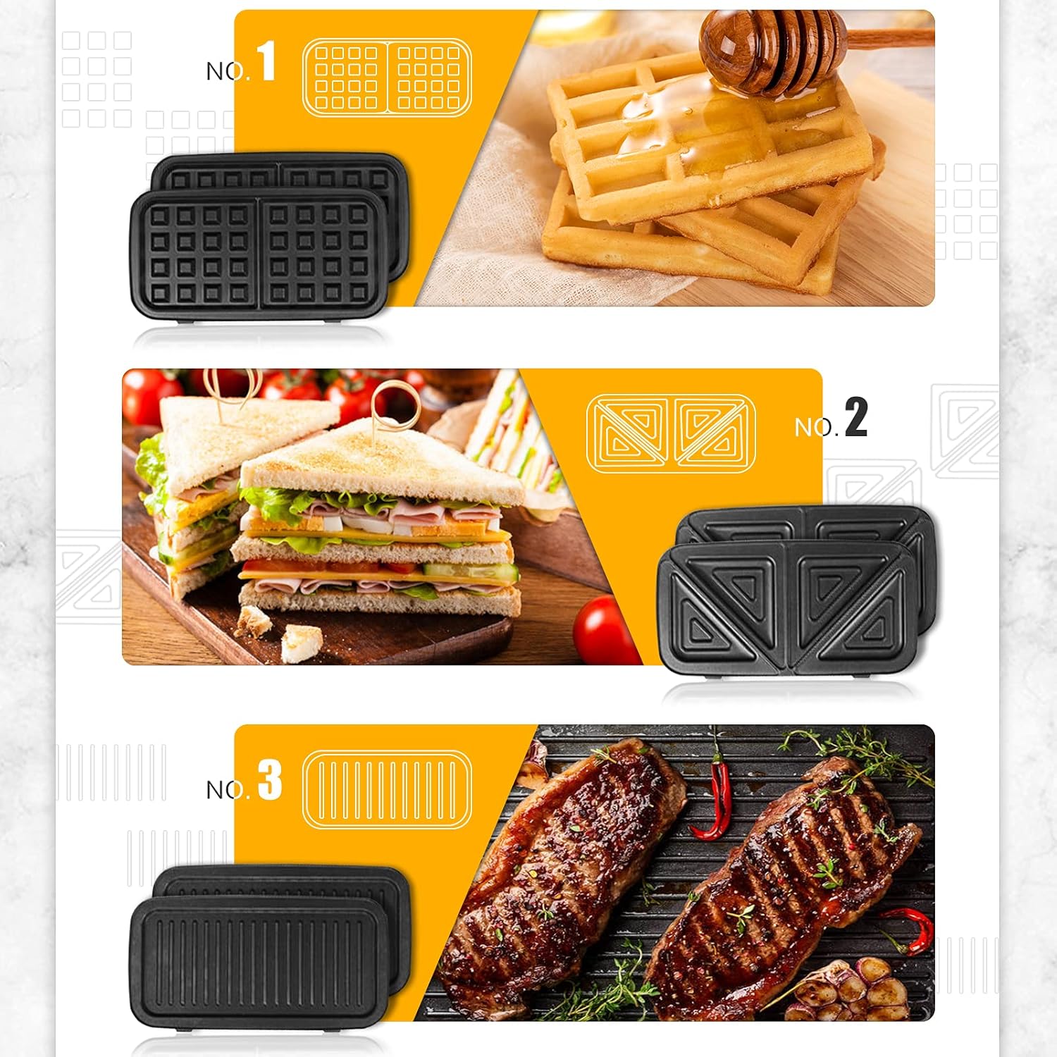 • 3-IN-1 MULTI-FUNCTION BAKING PLATE - there are three sets of plates that can be switched at will. The sandwich pan can be used to make sandwiches and heat bread slices; the waffle pan can be used to make waffle desserts, and the baking pan can grill steak, pork chops and corn, Potatoes, tomatoes, vegetables, etc., can also be used to press panini.