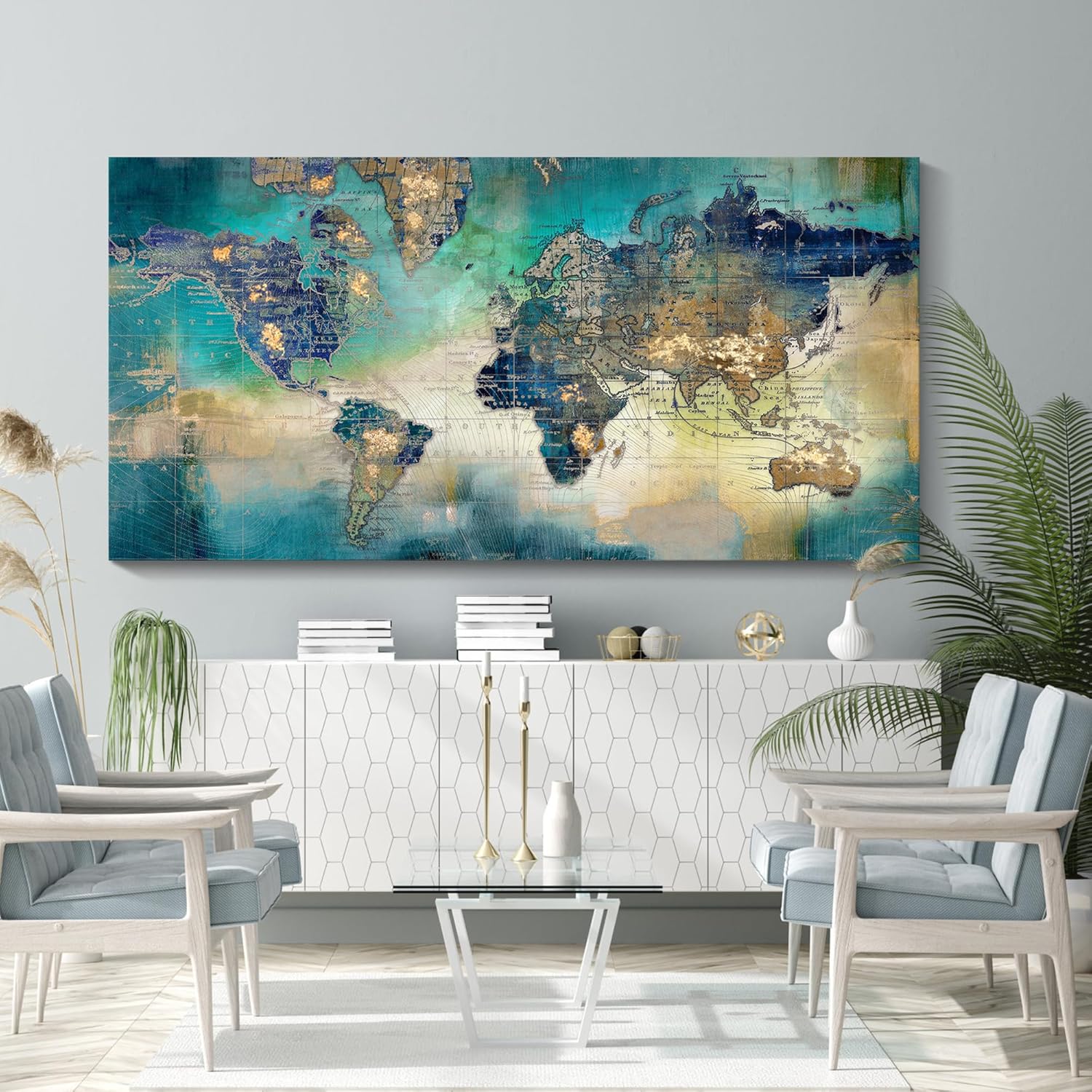Large World Map Canvas Prints Wall Art for Living Room Office 30x60 Green World Map Picture Artwork Decor for Home Decoration