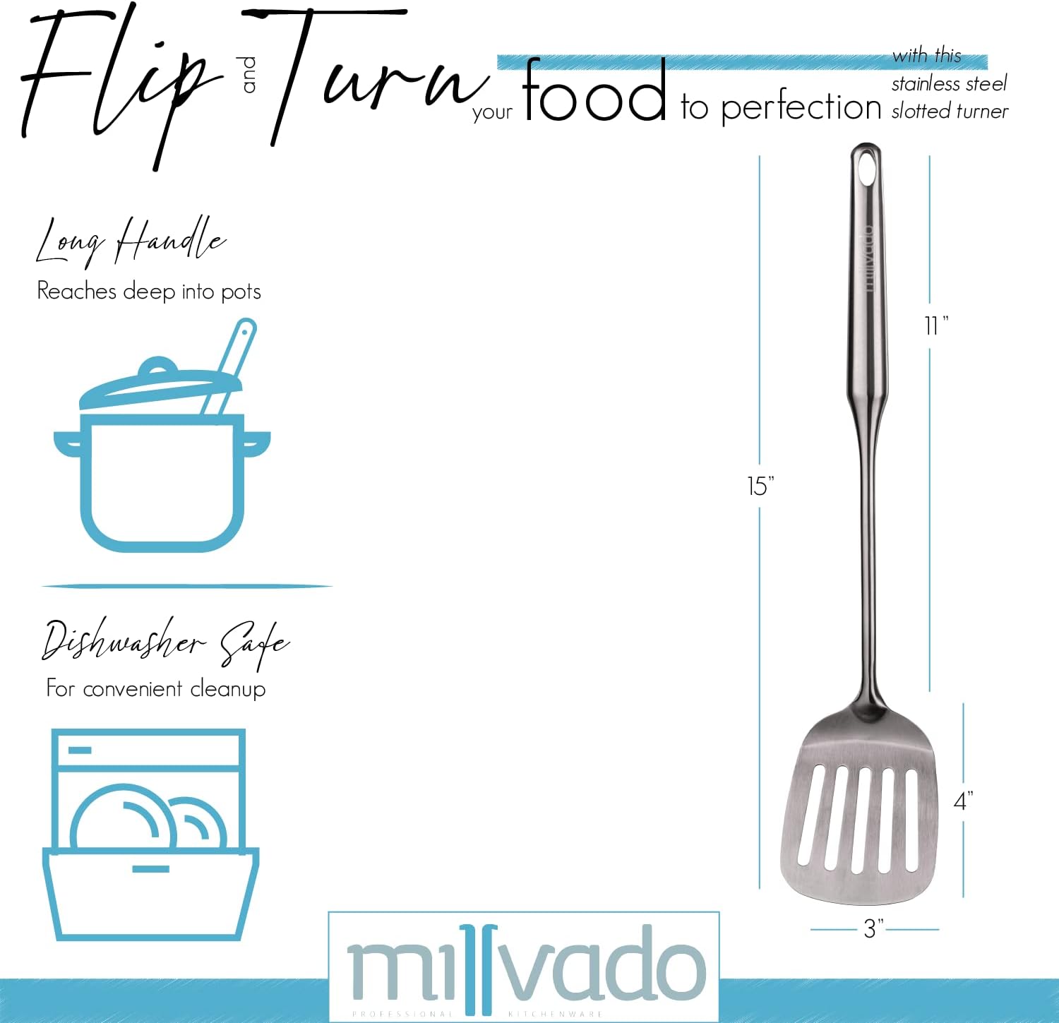 • SLOTTED TURNER: With this slotted turner you can calm those agitated nerves, since the slots will help drain excess oil when frying. You can now enjoy that burger, pancake, or BBQ without all that extra soggy fat. It's the #1 cooking tool!
